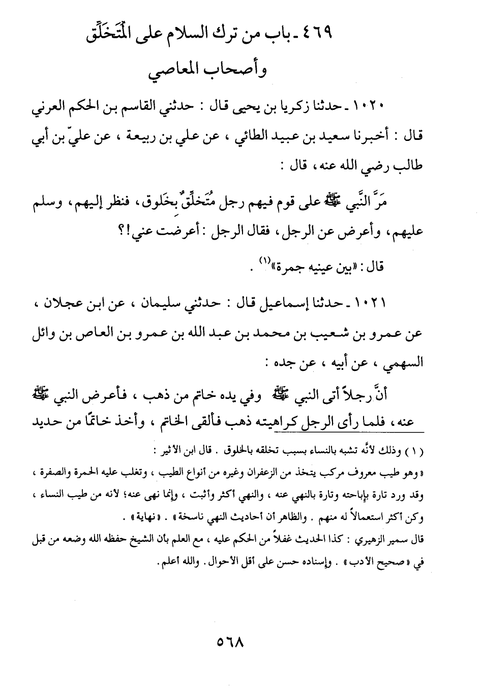 469- بَابُ مَنْ تَرَكَ السَّلَامَ عَلَى الْمُتَخَلِّقِ وَأَصْحَابِ المعاصي