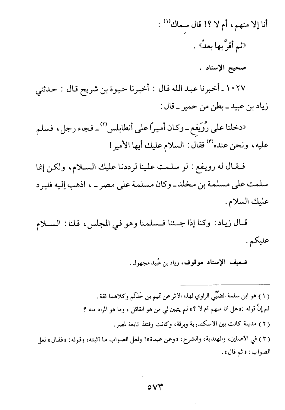 1027 - (ث 249) عن زياد بن عبيد الرعيني بَطْنٌ مِنْ حِمْيَرٍ قَالَ: دَخَلْنَا عَلَى رُوَيْفِعٍ وَكَانَ أَمِيرًا عَلَى أَنْطَابُلُسَ فَجَاءَ رَجُلٌ فَسَلَّمَ عليه فقال: السلام على الأمير، وعن عبدة فَقَالَ: السَّلَامُ عَلَيْكَ أَيُّهَا الْأَمِيرُ. فَقَالَ لَهُ رُوَيْفِعٌ: لَوْ سَلَّمْتَ عَلَيْنَا لَرَدَدْنَا عَلَيْكَ السَّلَامَ وَلَكِنْ إِنَّمَا سَلَّمْتَ عَلَى مَسْلَمَةَ بْنِ مَخْلَدٍ - وَكَانَ مَسْلَمَةُ عَلَى مِصْرَ - اذْهَبْ إِلَيْهِ فَلْيَرُدَّ عَلَيْكَ السَّلَامَ. قَالَ زِيَادٌ: وَكُنَّا إِذَا جِئْنَا فَسَلَّمْنَا وَهُوَ فِي الْمَجْلِسِ قُلْنَا السَّلَامُ عَلَيْكُمْ.
