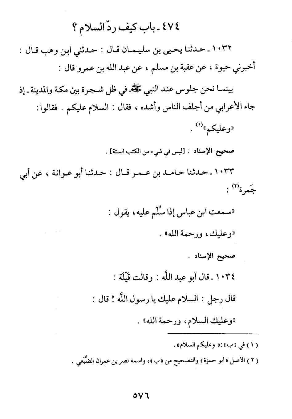 1032 - عن عبد الله بن عمرو رضي الله عنهما قَالَ: بَيْنَمَا نَحْنُ جُلُوسٌ عِنْدَ النَّبِيِّ صَلَّى اللهُ عَلَيْهِ وَسَلَّمَ فِي ظِلِّ شَجَرَةٍ بَيْنَ مَكَّةَ وَالْمَدِينَةِ إِذْ جَاءَ أَعْرَابِيٌّ مِنَ أَجْلَفِ النَّاسِ وَأَشَدِّهِمْ فَقَالَ: السَّلَامُ عَلَيْكُمْ فَقَالُوا: وَعَلَيْكُمُ.