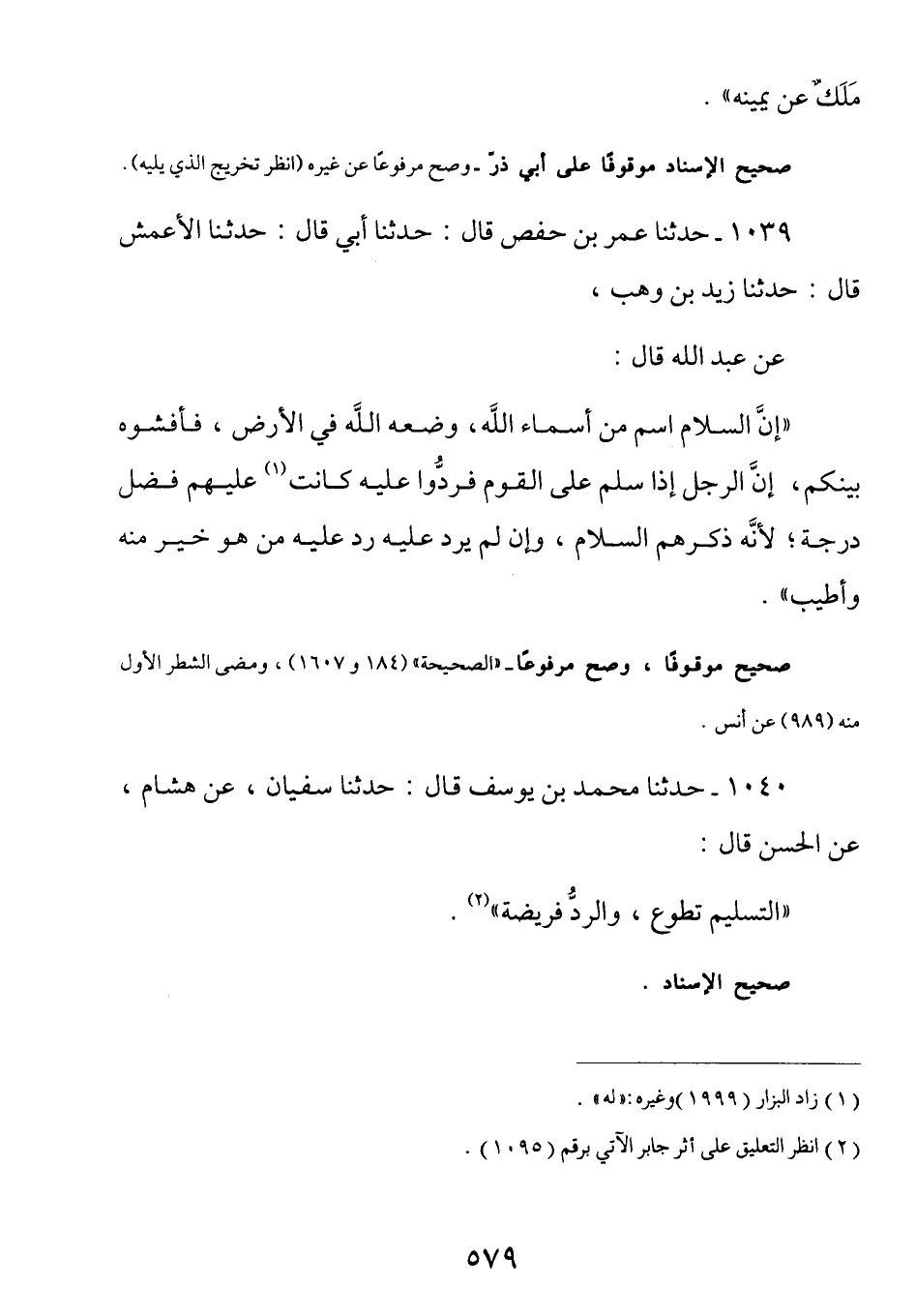 1039 - (ث 254) عن عبد الله رضي الله عنه قَالَ: إِنَّ السَّلَامَ اسْمٌ مِنْ أَسْمَاءِ اللَّهِ وَضَعَهُ اللَّهُ فِي الْأَرْضِ فَأَفْشُوهُ بَيْنَكُمْ، إِنَّ الرَّجُلَ إِذَا سَلَّمَ عَلَى الْقَوْمِ فَرَدُّوا عَلَيْهِ كَانَتْ لَه عَلَيْهِمْ فَضْلُ دَرَجَةٍ لِأَنَّهُ ذَكَّرَهُمُ السَّلَامَ، وَإِنْ لَمْ يُرَدَّ عَلَيْهِ رَدَّ عَلَيْهِ من هو خير منه وأطيب.