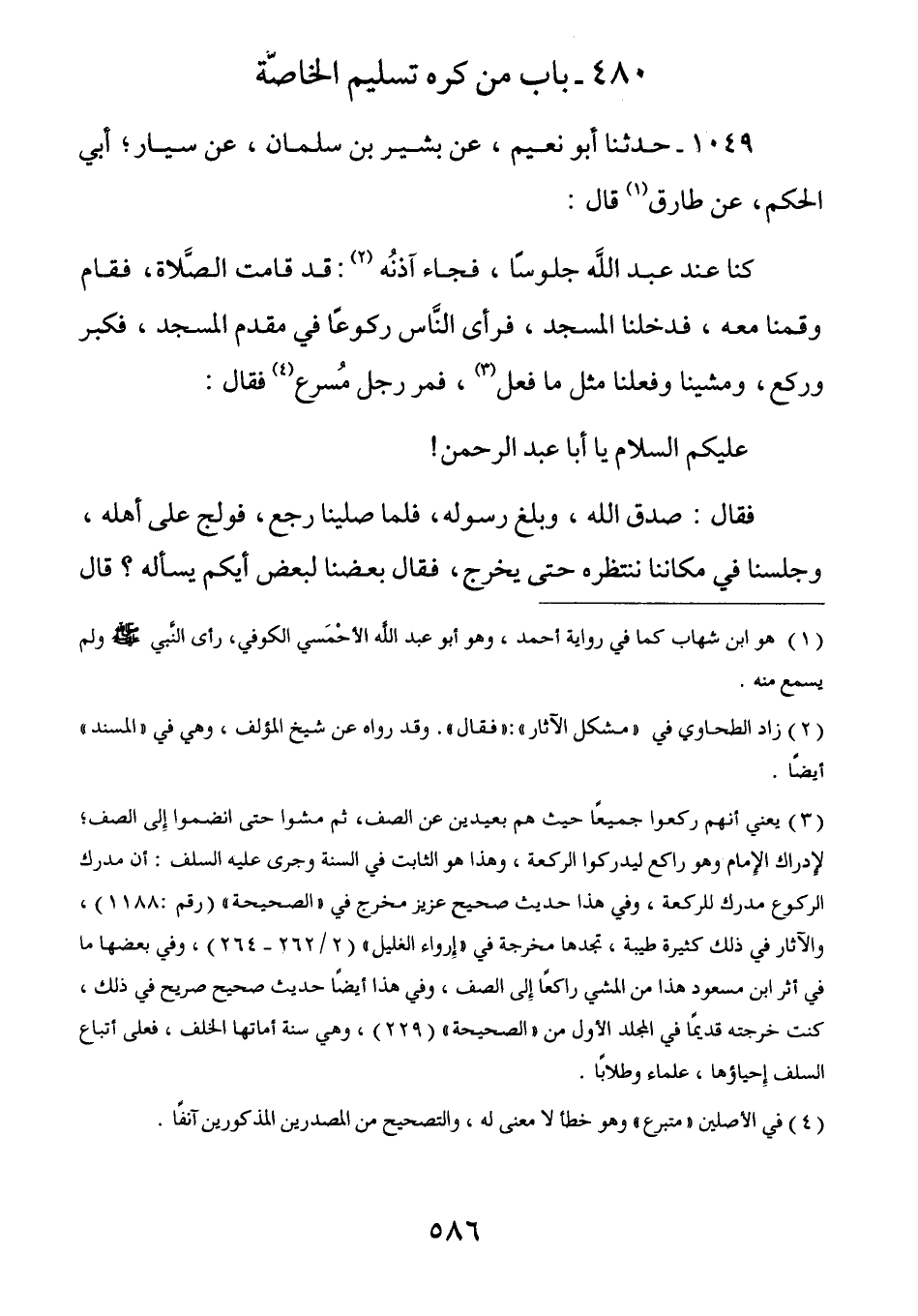 1049 - عَنْ طَارِقٍ قَالَ: كُنَّا عِنْدَ عَبْدِ اللَّهِ جلوسا فجاء آذنه قَدْ قَامَتِ الصَّلَاةُ فَقَامَ وَقُمْنَا مَعَهُ فَدَخَلْنَا الْمَسْجِدَ فَرَأَى النَّاسَ رُكُوعًا فِي مُقَدَّمِ الْمَسْجِدِ فَكَبَّرَ وَرَكَعَ وَمَشَيْنَا وَفَعَلْنَا مِثْلَ مَا فَعَلَ فَمَرَّ رَجُلٌ مُسْرِعٌ فَقَالَ: عَلَيْكُمُ السَّلَامُ يَا أَبَا عَبْدِ الرَّحْمَنِ فَقَالَ: صَدَقَ اللَّهُ وَبَلَّغَ رَسُولُهُ فَلَمَّا صَلَّيْنَا رَجَعَ فَوَلَجَ عَلَى أَهْلِهِ وَجَلَسْنَا فِي مَكَانِنَا نَنْتَظِرُهُ حَتَّى يَخْرُجَ فَقَالَ: بَعْضُنَا لِبَعْضٍ أَيُّكُمْ يَسْأَلُهُ؟ قَالَ: