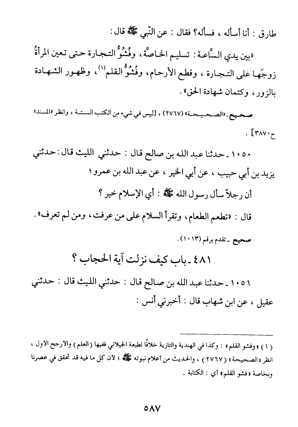 طَارِقٌ أَنَا أَسْأَلُهُ. فَسَأَلَهُ فَقَالَ: عَنِ النَّبِيِّ صَلَّى اللهُ عَلَيْهِ وَسَلَّمَ قَالَ: (بَيْنَ يَدَيِ السَّاعَةِ تَسْلِيمُ الْخَاصَّةِ وَفُشُوُّ التِّجَارَةِ حَتَّى تُعِينَ الْمَرْأَةُ زَوْجَهَا عَلَى التِّجَارَةِ وَقَطْعُ الْأَرْحَامِ وَفُشُوُّ العلم وظهور الشهادة بالزور وكتمان شهادة الحق)