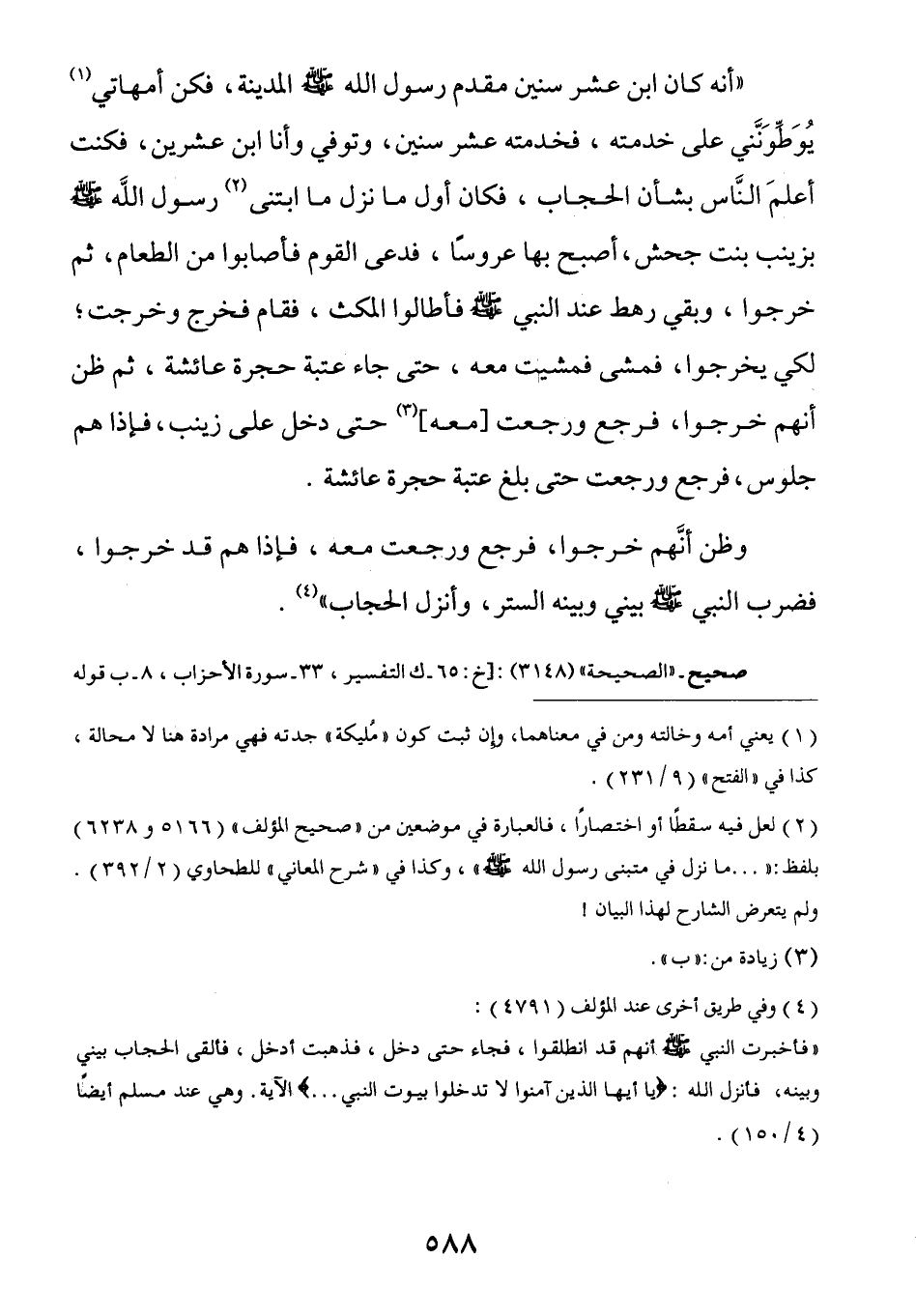 أَنَّهُ كَانَ ابْنَ عَشْرِ سِنِينَ مَقْدَمَ رَسُولُ اللَّهِ صَلَّى اللهُ عَلَيْهِ وَسَلَّمَ الْمَدِينَةَ فَكُنَّ أُمَّهَاتِي يُوَطِّوَنَّنِي عَلَى خِدْمَتِهِ فَخَدَمْتُهُ عَشْرَ سِنِينَ وتوفي وأنا بن عِشْرِينَ فَكُنْتُ أَعْلَمَ النَّاسِ بِشَأْنِ الْحِجَابِ فَكَانَ أَوَّلُ مَا نَزَلَ مَا ابْتَنَى رَسُولُ اللَّهِ صَلَّى اللهُ عَلَيْهِ وَسَلَّمَ بِزَيْنَبَ بِنْتِ جَحْشٍ أصبح بها عروسا فدعا الْقَوْمَ فَأَصَابُوا مِنَ الطَّعَامِ ثُمَّ خَرَجُوا وَبَقِيَ رَهْطٌ عِنْدَ النَّبِيِّ صَلَّى اللهُ عَلَيْهِ وَسَلَّمَ فَأَطَالُوا الْمُكْثَ فَقَامَ فَخَرَجَ وَخَرَجْتُ لِكَيْ يَخْرُجُوا فَمَشَى فَمَشَيْتُ مَعَهُ حَتَّى جَاءَ عَتَبَةَ حُجْرَةِ عَائِشَةَ ثُمَّ ظَنَّ أَنَّهُمْ خَرَجُوا فَرَجَعَ وَرَجَعْتُ حَتَّى دَخَلَ عَلَى زَيْنَبَ فَإِذَا هُمْ جُلُوسٌ فَرَجَعَ وَرَجَعْتُ حَتَّى بَلَغَ عَتَبَةَ حُجْرَةِ عَائِشَةَ وَظَنَّ أَنَّهُمْ خَرَجُوا فَرَجَعَ وَرَجَعْتُ مَعَهُ فَإِذَا هُمْ قَدْ خَرَجُوا فَضَرَبَ النَّبِيُّ صَلَّى اللهُ عَلَيْهِ وَسَلَّمَ بَيْنِي وَبَيْنَهُ السِّتْرَ وَأَنْزَلَ الْحِجَابَ.