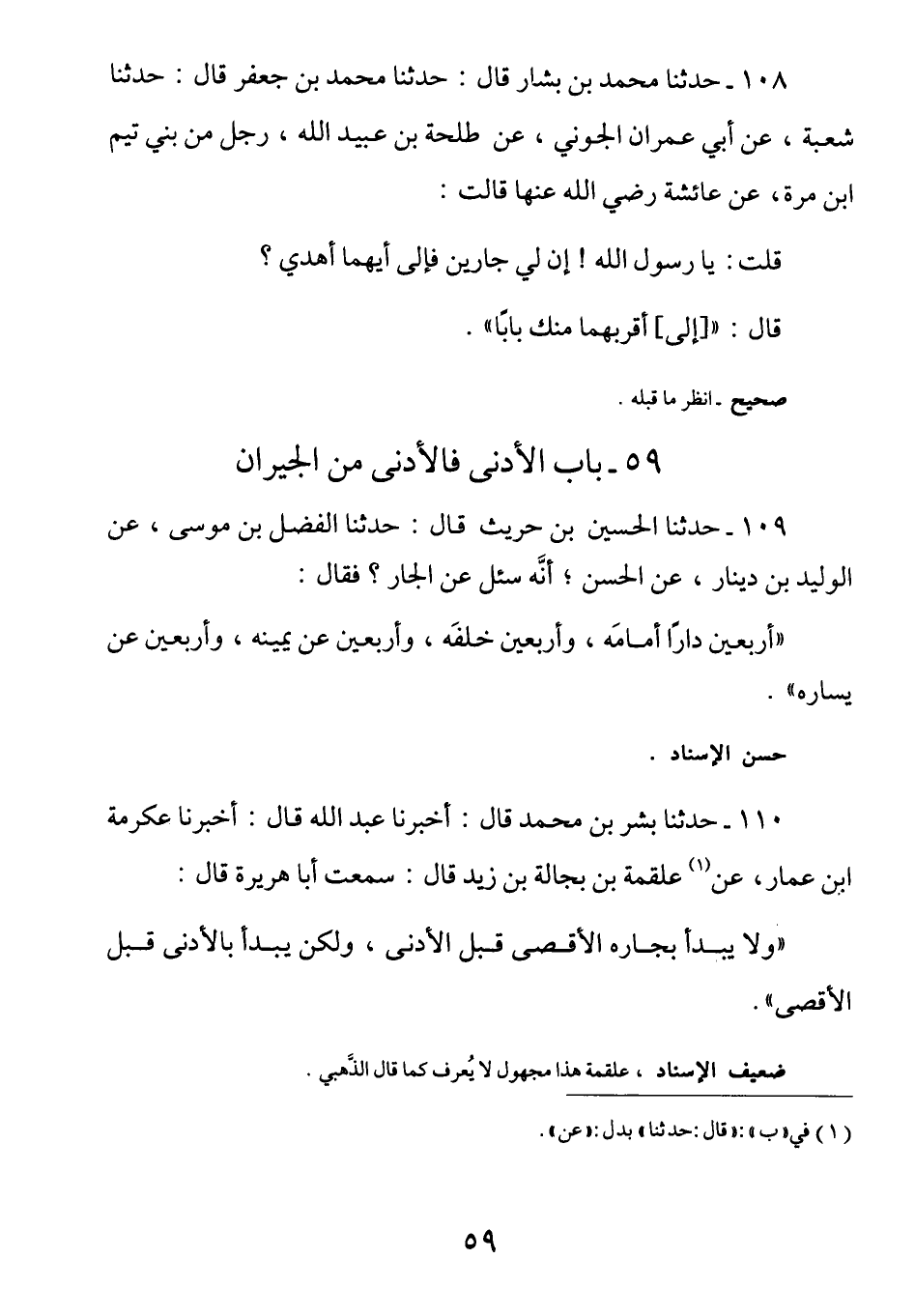 110 - (ث 32) عن أبي هريرة - رضي الله عنه - قَالَ: وَلَا يَبْدَأُ بِجَارِهِ الْأَقْصَى قَبْلَ الْأَدْنَى ولكن يبدأ بالأدنى قبل الأقصى