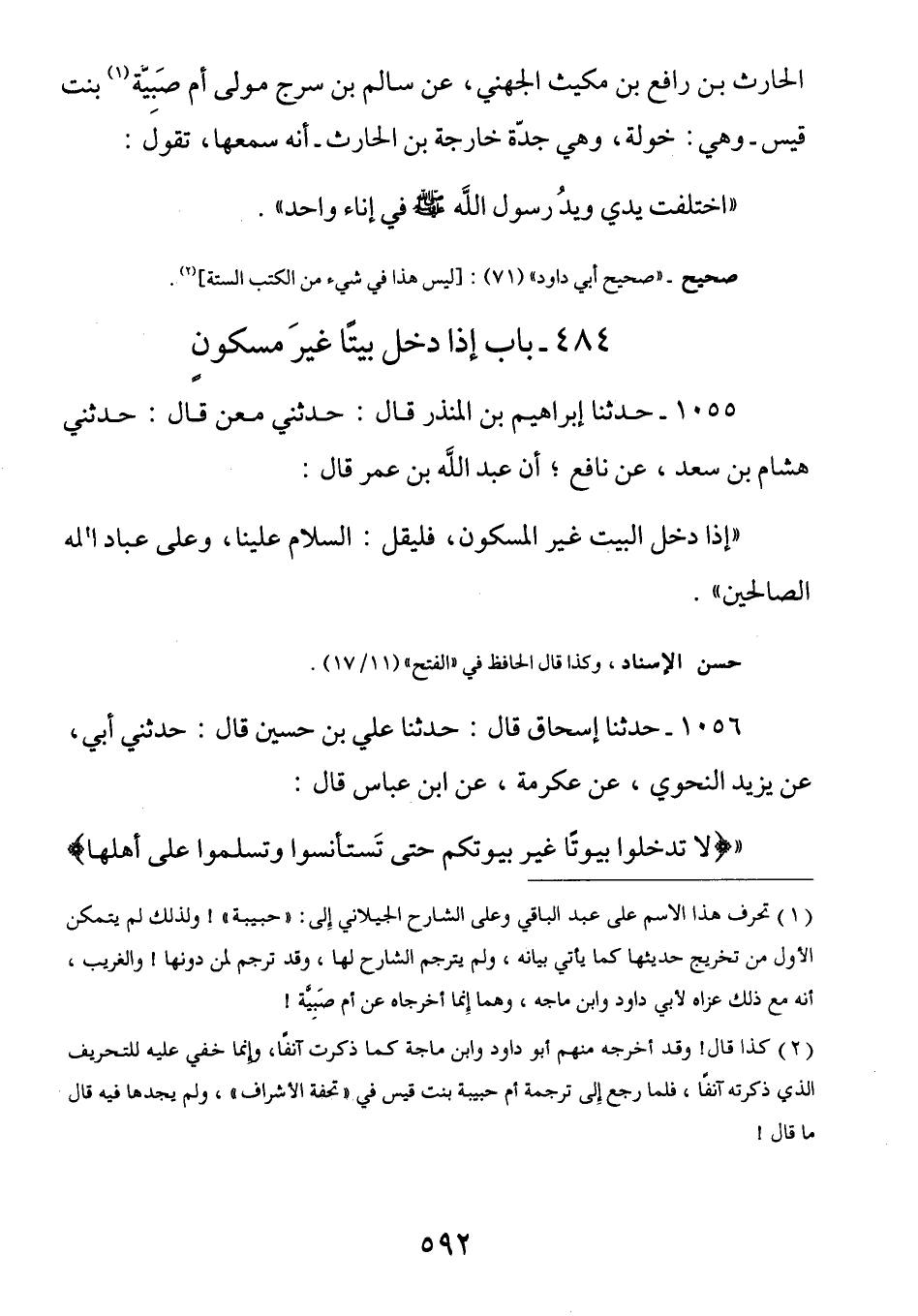 1056 - (ث 262) عن ابن عباس رضي الله عنهما قَالَ: (لَا تَدْخُلُوا بُيُوتاً غَيْرَ بُيُوتِكُمْ حَتَّى تَسْتَأْنِسُوا وَتُسَلِّمُوا عَلَى أَهْلِهَا)