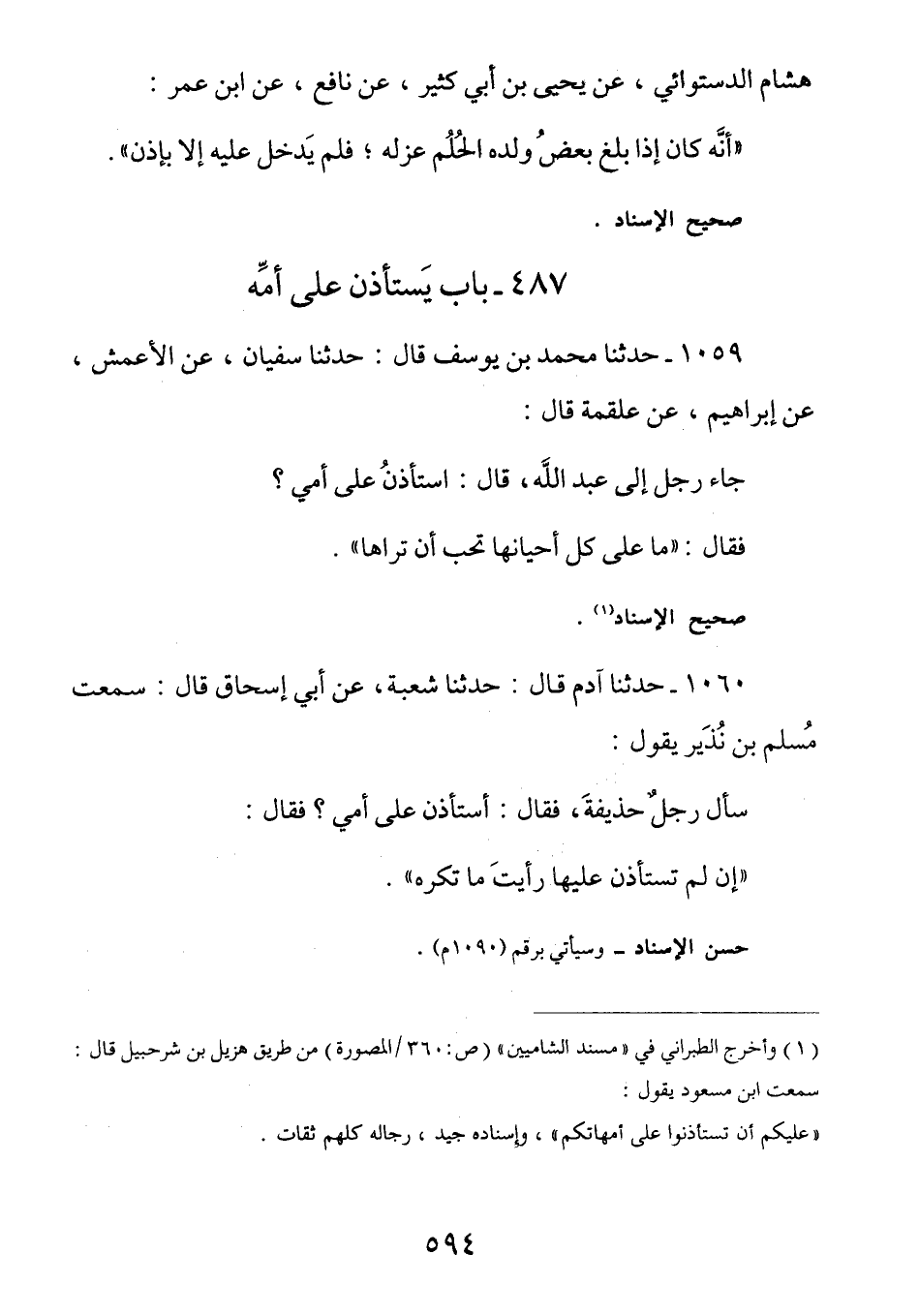 1059 - (ث265) عَنْ عَلْقَمَةَ قَالَ: جَاءَ رَجُلٌ إِلَى عَبْدِ الله قال: أأستأذن عَلَى أُمِّي؟ فَقَالَ: مَا عَلَى كُلِّ أَحْيَانِهَا تحب أن تراها.