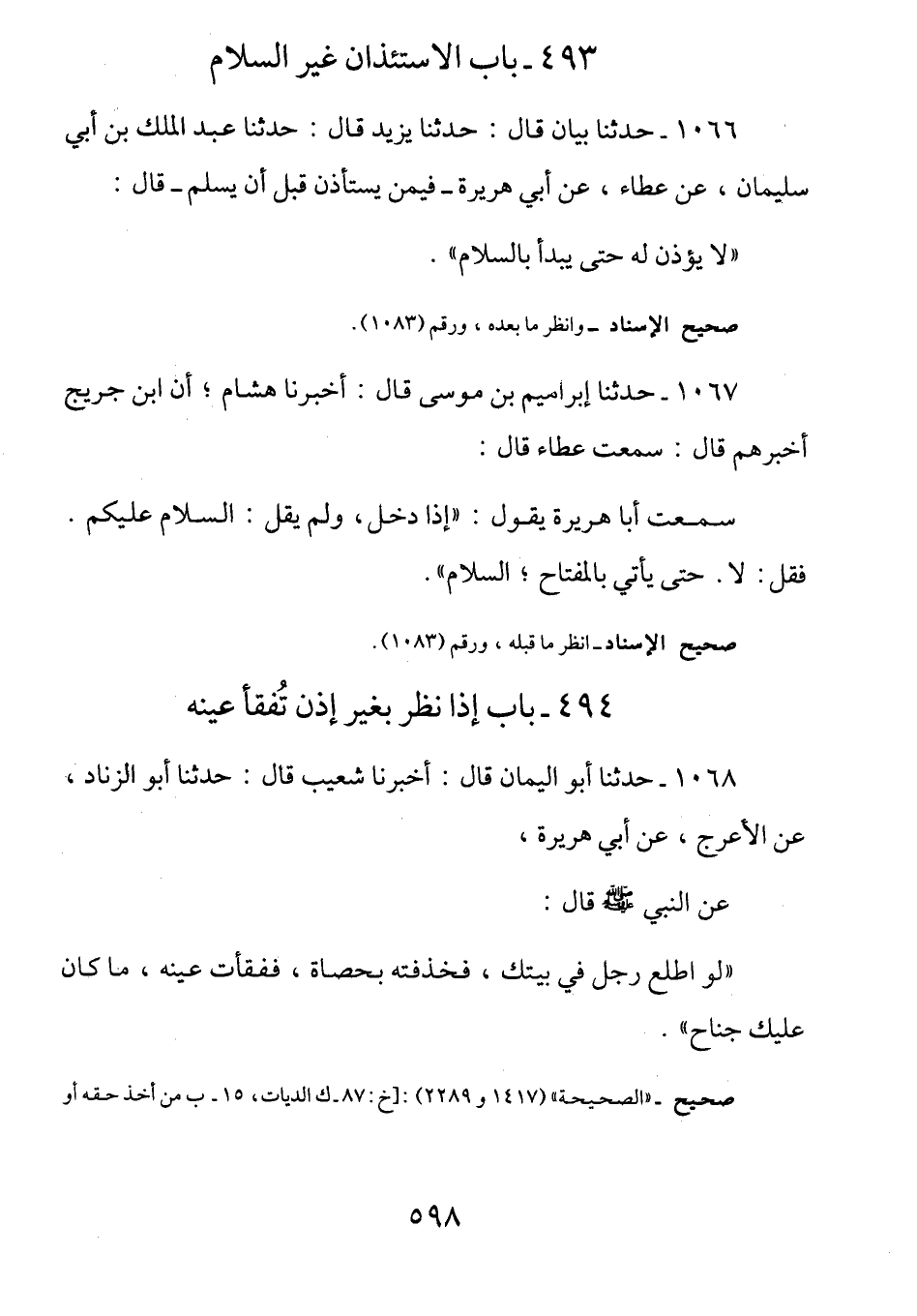 1066 - (ث271) عن أبي هريرة رضي الله عنه فِيمَنْ يَسْتَأْذِنُ قَبْلَ أَنْ يُسَلِّمَ قَالَ: لَا يؤذن له حتى يبدأ بالسلام.
