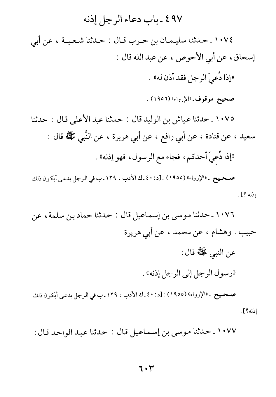 1076 - عَنْ أَبِي هُرَيْرَةَ رَضِيَ اللَّهُ عَنْهُ عَنِ النَّبِيِّ صَلَّى اللهُ عَلَيْهِ وَسَلَّمَ قَالَ: (رسول الرجل إلى الرجل إذنه)