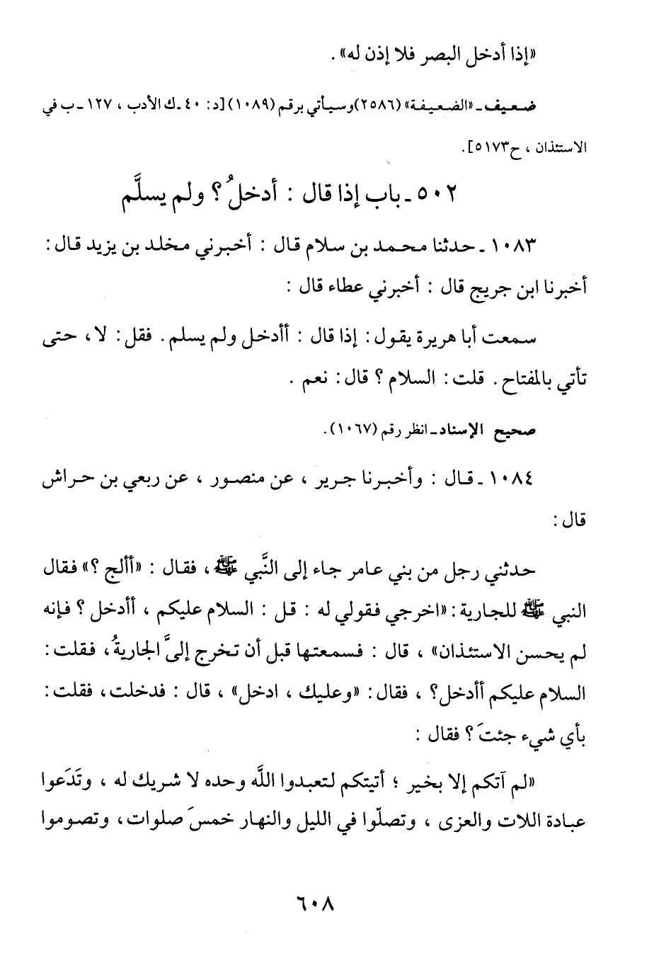 1083 - (ث 276) عن عطاء قال: سمعت أبا هريرة رضي الله عنه يَقُولُ: إِذَا قَالَ أَأَدْخُلُ وَلَمْ يُسَلِّمْ فَقُلْ: لَا حَتَّى تَأْتِيَ بِالْمِفْتَاحِ. قُلْتُ: السَّلَامُ؟ قَالَ: نعم