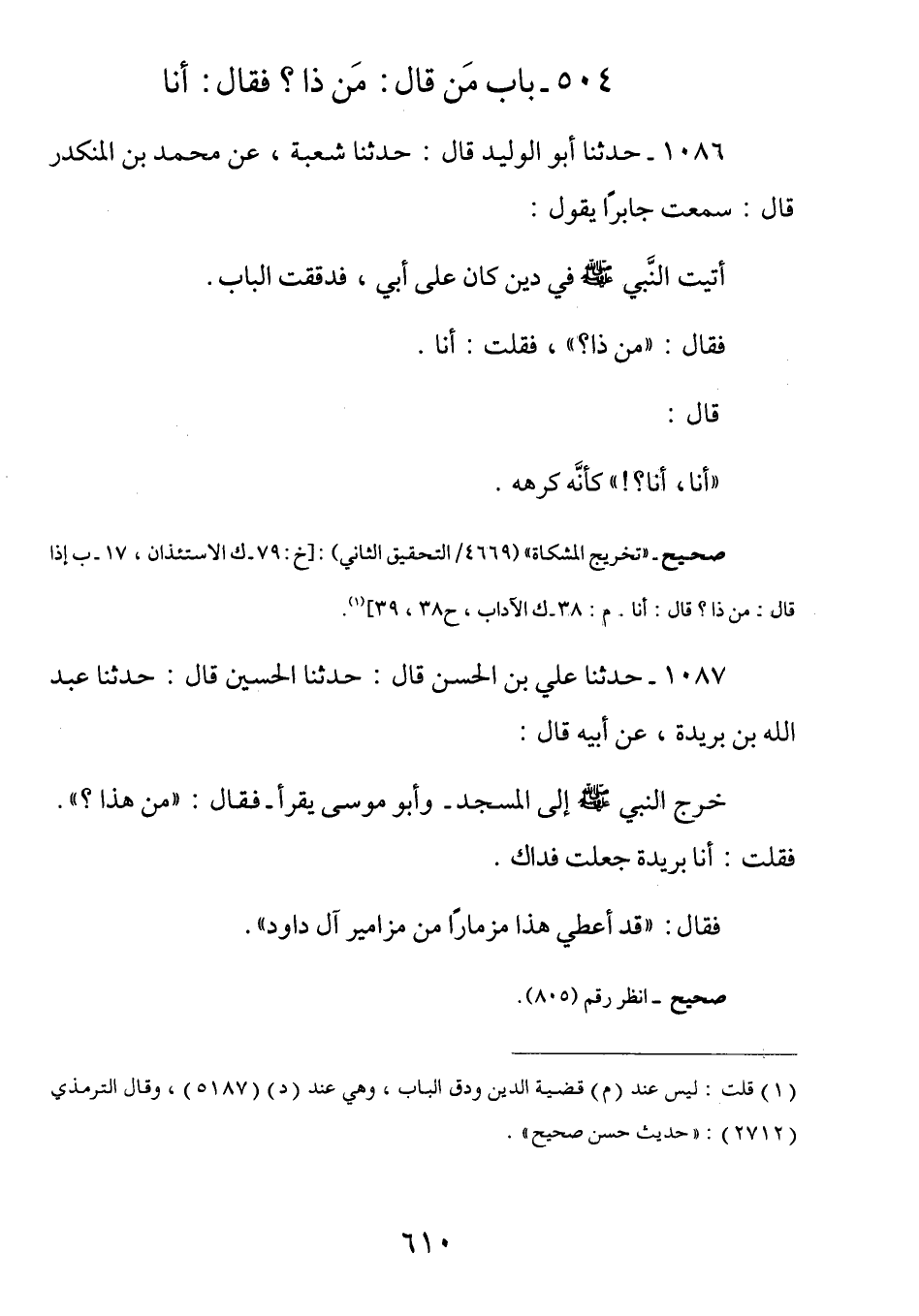 1086 - عن جابررضي الله عنه قَالَ: أَتَيْتُ النَّبِيَّ صَلَّى اللهُ عَلَيْهِ وَسَلَّمَ فِي دَيْنٍ كَانَ عَلَى أَبِي فَدَقَقْتُ الْبَابَ فَقَالَ: (مَنْ ذَا؟) فَقُلْتُ: أَنَا. قَالَ: (أَنَا، أنا) كأنه كرهه.