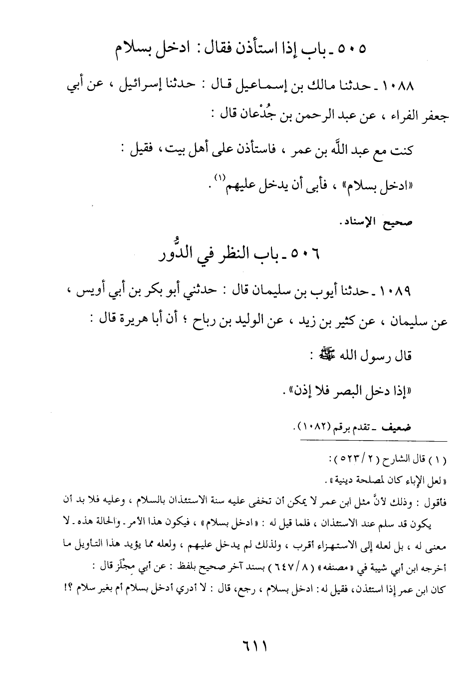 1088 - (ث 277) عَنْ عَبْدِ الرَّحْمَنِ بْنِ جُدْعَانَ قَالَ: كُنْتُ مَعَ عَبْدِ اللَّهِ بْنِ عُمَرَ فَاسْتَأْذَنَ عَلَى أَهْلِ بَيْتٍ فَقِيلَ: ادْخُلْ بِسَلَامٍ فَأَبَى أَنْ يدخل عليهم.