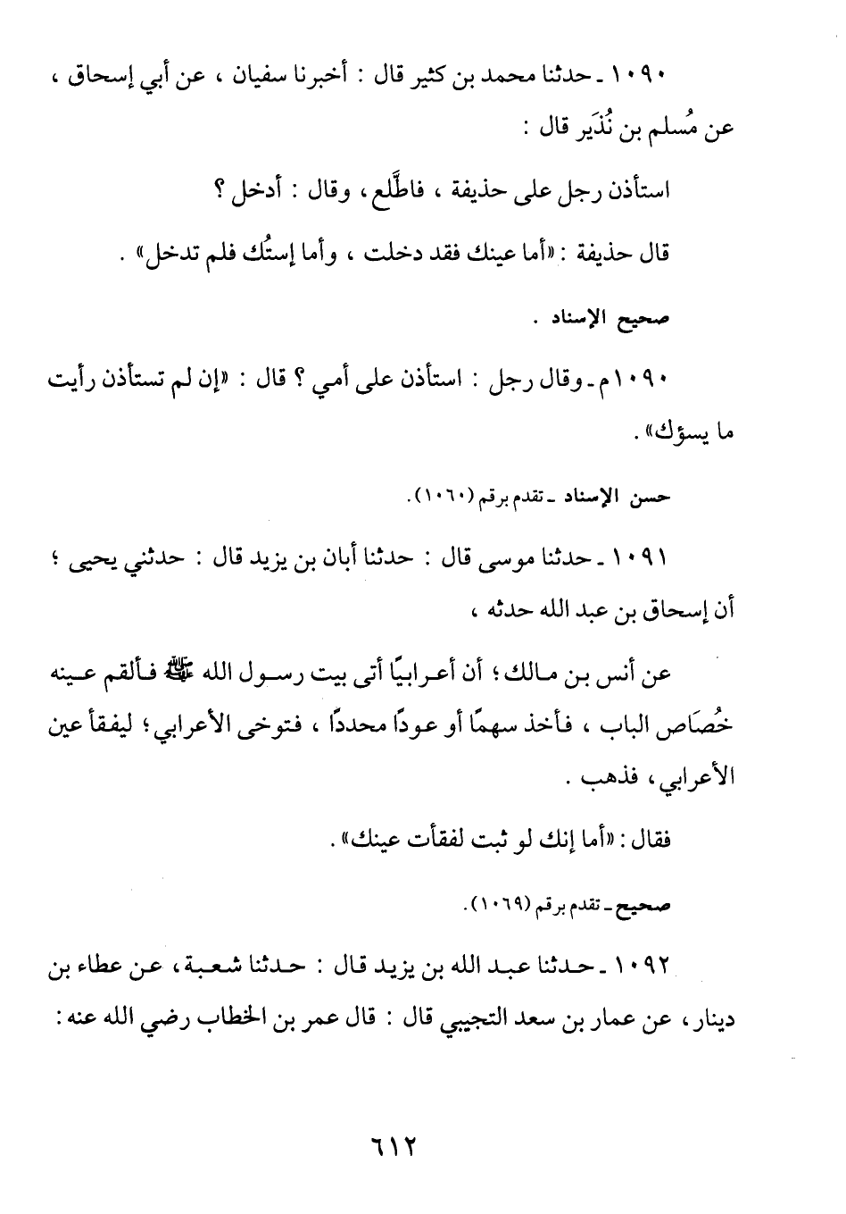 1091 - عن أنس بن مالك رضي الله عنه أَنَّ أَعْرَابِيًّا أَتَى بَيْتَ رَسُولِ اللَّهِ صَلَّى الله عليه وسلم فألقم عينه خصاص الْبَابِ فَأَخَذَ سَهْمًا أَوْ عُودًا مُحَدَّدًا فَتَوَخَّى الْأَعْرَابِيَّ لِيَفْقَأَ عَيْنَ الْأَعْرَابِيِّ فَذَهَبَ فَقَالَ: (أَمَا إنك لو ثبت لفقأت عينك)
