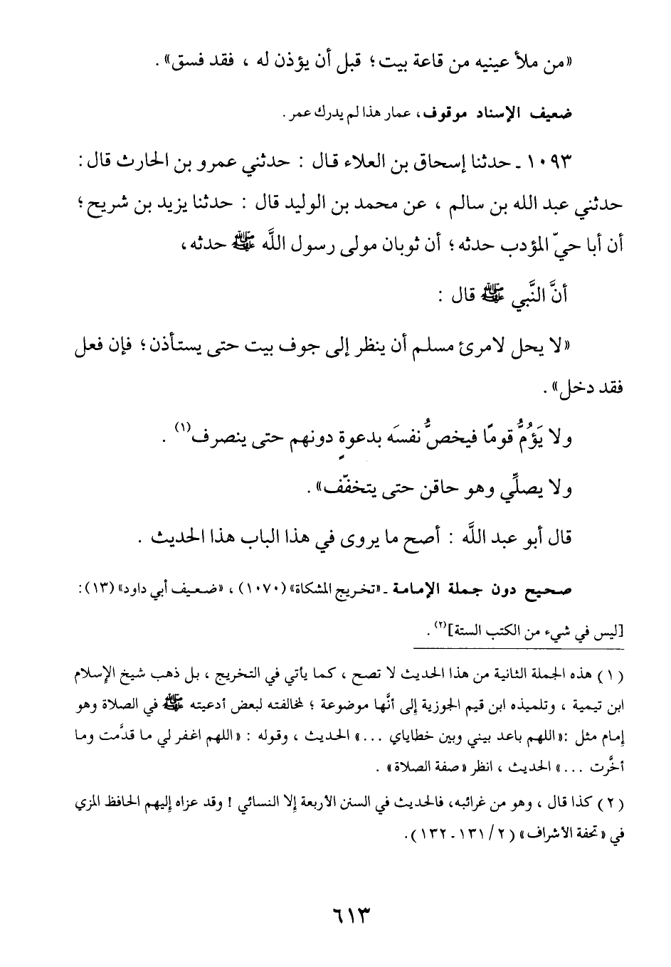 1093 - عن ثوبان رضي الله عنه - مَوْلَى رَسُولِ اللَّهِ صَلَّى اللهُ عَلَيْهِ وَسَلَّمَ - أَنَّ النَّبِيِّ صَلَّى اللهُ عَلَيْهِ وَسَلَّمَ قَالَ: (لَا يَحِلُّ لِامْرِئٍ مُسْلِمٍ أَنْ يَنْظُرَ إِلَى جَوْفِ بَيْتٍ حَتَّى يَسْتَأْذِنَ، فَإِنْ فَعَلَ فَقَدْ دَخَلَ، وَلَا يَؤُمُّ قَوْمًا فَيَخُصُّ نَفْسَهُ بِدَعْوَةٍ دُونَهُمْ حَتَّى يَنْصَرِفَ، وَلَا يُصَلِّي وَهُوَ حَاقِنٌ حَتَّى يَتَخَفَّفَ) .