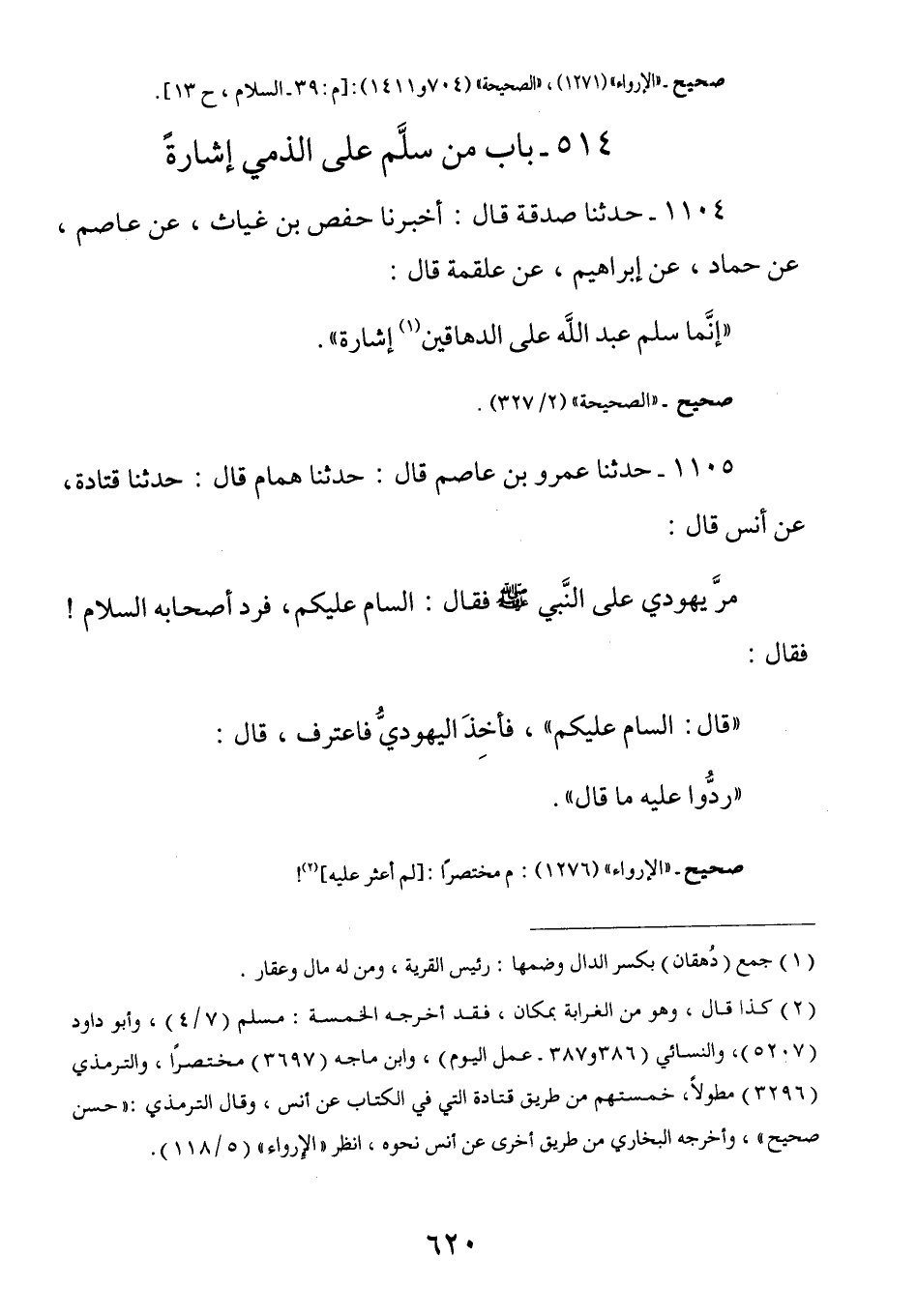 1105 - عن أنسرضي الله عنه قَالَ: مَرَّ يَهُودِيٌّ عَلَى النَّبِيِّ صَلَّى اللهُ عَلَيْهِ وَسَلَّمَ فَقَالَ السَّامُ عَلَيْكُمْ فَرَدَّ أَصْحَابُهُ السَّلَامَ فَقَالَ: (قَالَ: السَّامُ عَلَيْكُمْ) فَأُخِذَ الْيَهُودِيُّ فاعترف قال: (ردوا عليه ما قال)