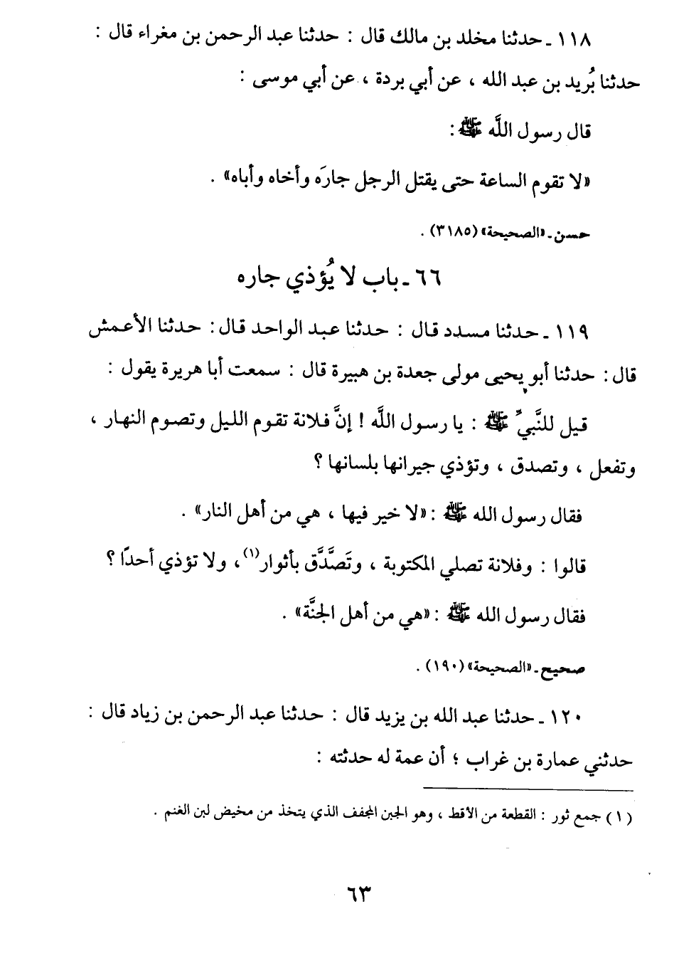 119 - عن أبي هريرة - رضي الله عنه - قال: قِيلَ لِلنَّبِيِّ صَلَّى اللهُ عَلَيْهِ وَسَلَّمَ يَا رَسُولَ اللَّهِ إِنَّ فُلَانَةً تَقُومُ اللَّيْلَ وَتَصُومُ النَّهَارَ وَتَفْعَلُ وَتَصَّدَّقُ وَتُؤْذِي جِيرَانَهَا بِلِسَانِهَا؟ فَقَالَ: رَسُولُ اللَّهِ صَلَّى اللهُ عَلَيْهِ وَسَلَّمَ: (لَا خير فيها هى من أهل النار) وَفُلَانَةٌ تُصَلِّي الْمَكْتُوبَةَ وَتَصَّدَّقُ بِأَثْوَارٍ (¬1) وَلَا تُؤْذِي أَحَدًا؟