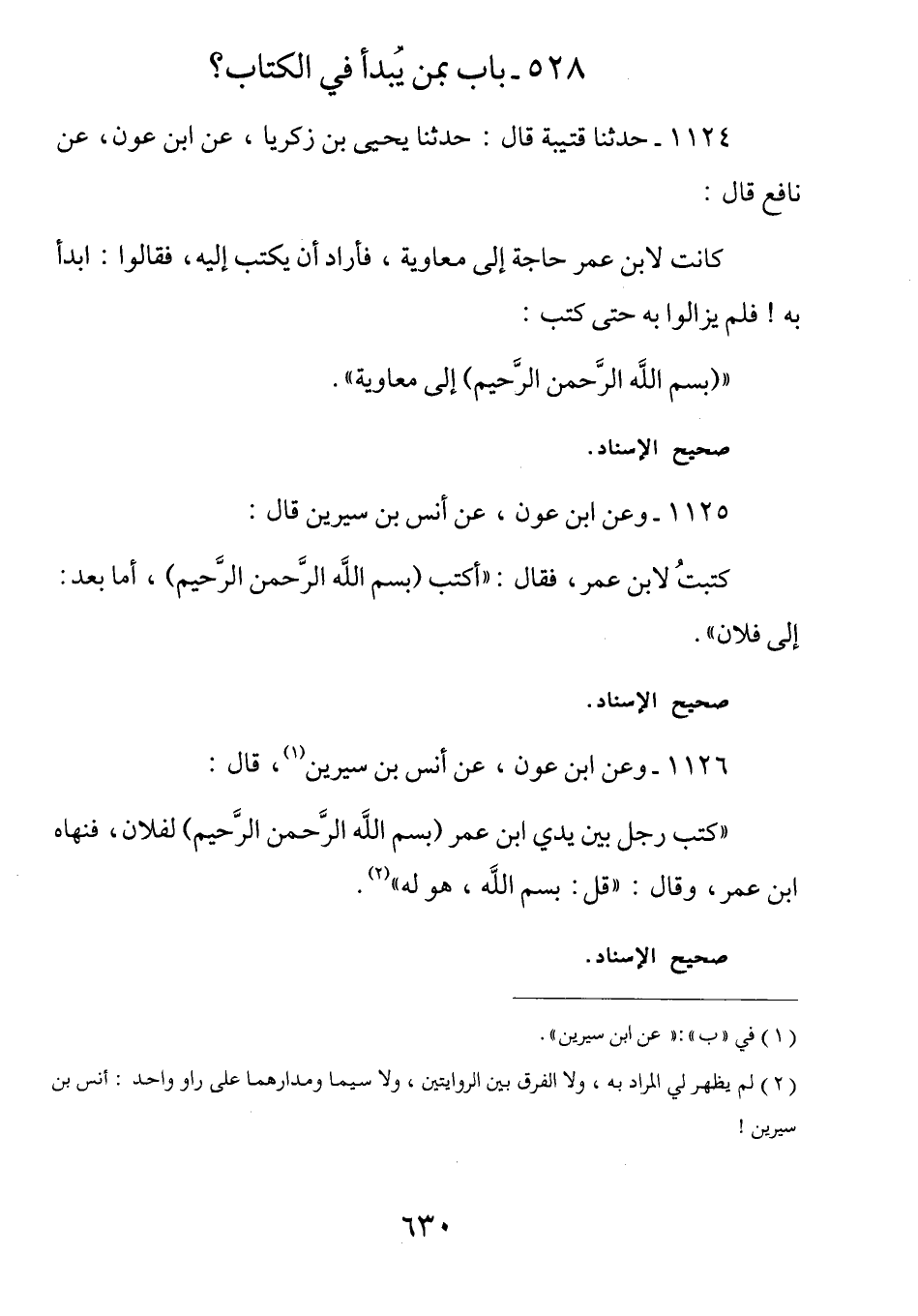 1125 - (ث 299) عَنْ أَنَسِ بْنِ سِيرِينَ قَالَ: كَتَبْتُ لِابْنِ عُمَرَ فَقَالَ: اكْتُبْ بِسْمِ اللَّهِ الرَّحْمَنِ الرَّحِيمِ أما بعد إلى فلان.