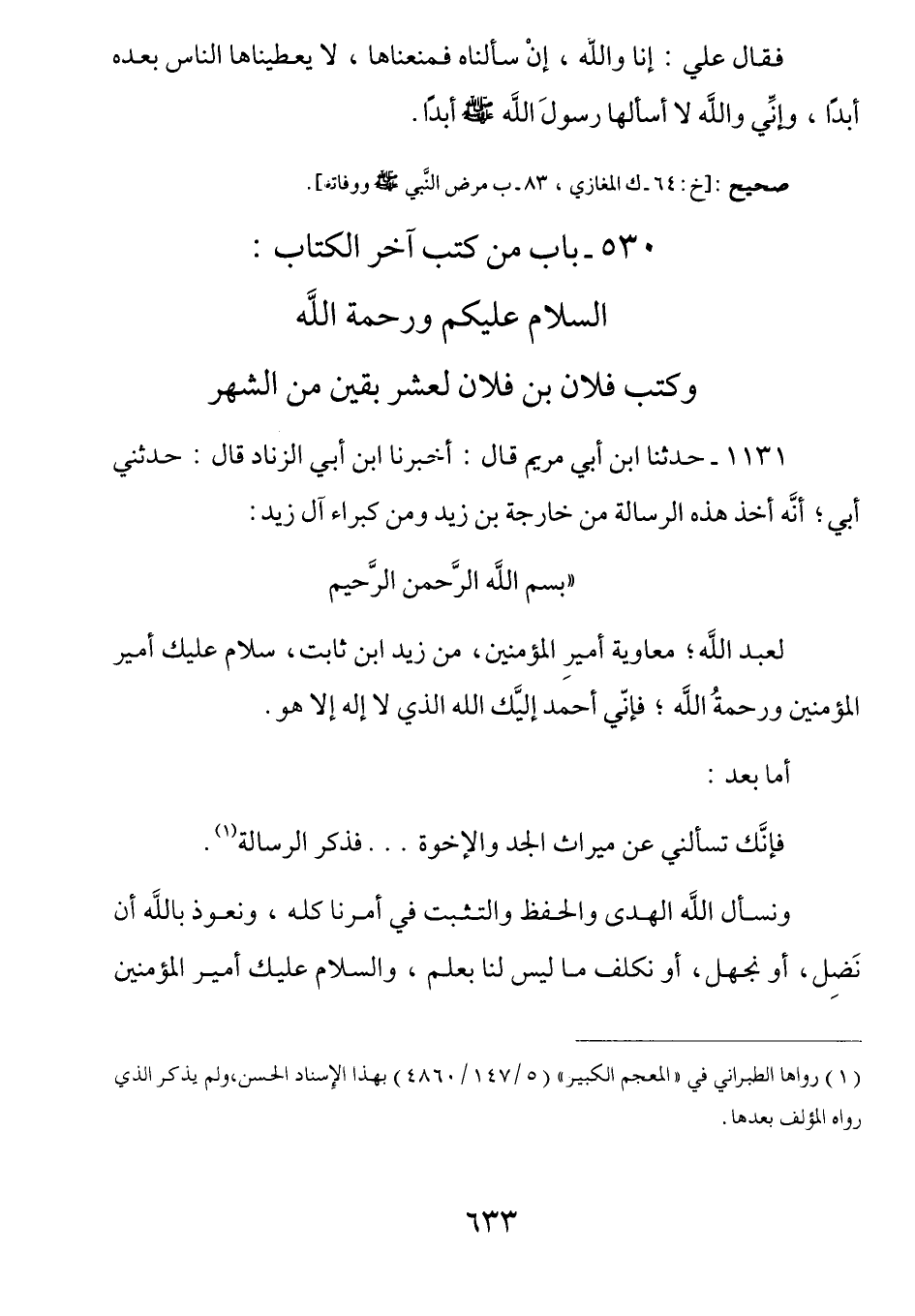 1131 - (302) عن ابْنُ أَبِي الزِّنَادِ قَالَ: حَدَّثَنِي أَبِي أَنَّهُ أَخَذَ هَذِهِ الرِّسَالَةَ مِنْ خَارِجَةَ بْنِ زَيْدٍ وَمِنْ كُبَرَاءِ آلِ زَيْدٍ بِسْمِ اللَّهِ الرَّحْمَنِ الرَّحِيمِ لِعَبْدِ اللَّهِ مُعَاوِيَةَ أَمِيرِ الْمُؤْمِنِينَ مِنْ زَيْدِ بْنِ ثَابِتٍ سَلَامٌ عَلَيْكَ أَمِيرَ الْمُؤْمِنِينَ وَرَحْمَةُ اللَّهِ فَإِنِّي أَحْمَدُ إِلَيْكَ اللَّهَ الَّذِي لَا إِلَهَ إِلَّا هُوَ أَمَّا بَعْدُ فَإِنَّكَ تَسْأَلُنِي عَنْ مِيرَاثِ الْجَدِّ وَالْإِخْوَةِ فَذَكَرَ الرِّسَالَةَ وَنَسْأَلُ اللَّهَ الْهُدَى وَالْحِفْظَ وَالتَّثَبُّتَ فِي أَمْرِنَا كُلِّهِ وَنَعُوذُ بِاللَّهِ أَنْ نَضِلَّ أَوْ نَجْهَلَ أو نتكلف مَا لَيْسَ لَنَا بِهِ عِلْمٌ وَالسَّلَامُ عَلَيْكَ أمير المؤمنين