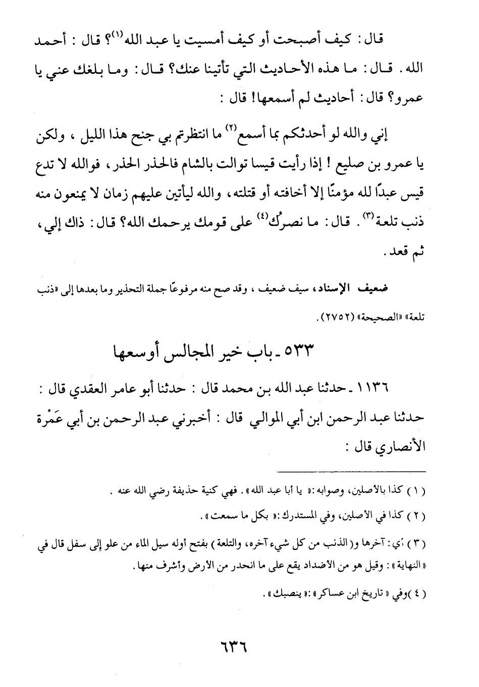 قَالَ: كَيْفَ أَصْبَحْتَ أَوْ كَيْفَ أَمْسَيْتَ يَا عَبْدَ اللَّهِ؟ قَالَ: أَحْمَدُ اللَّهَ. قَالَ: مَا هَذِهِ الْأَحَادِيثُ الَّتِي تَأْتِينَا عَنْكَ؟ قَالَ: وَمَا بَلَغَكَ عَنِّي يَا عَمْرُو؟ قَالَ: أَحَادِيثُ لَمْ أسمعها. قال: إني والله لو أحدثكم بما أسمع مَا انْتَظَرْتُمْ بِي جُنْحَ هَذَا اللَّيْلِ، وَلَكِنْ يَا عَمْرُو بْنَ صُلَيْعٍ إِذَا رَأَيْتَ قَيْسًا تَوَالَتْ بِالشَّامِ فَالْحَذَرَ الْحَذَرَ، فَوَاللَّهِ لَا تَدَعُ قَيْسٌ عَبْدًا لِلَّهِ مُؤْمِنًا إِلَّا أَخَافَتْهُ أَوْ قَتَلَتْهُ وَاللَّهِ لَيَأْتِيَنَّ عَلَيْهِمْ زَمَانٌ لَا يَمْنَعُونَ فيه ذنب تلعة (¬1) . قال: ما نصرك على قومك يرحمك الله؟ قال: ذلك إلي ثم قعد.
