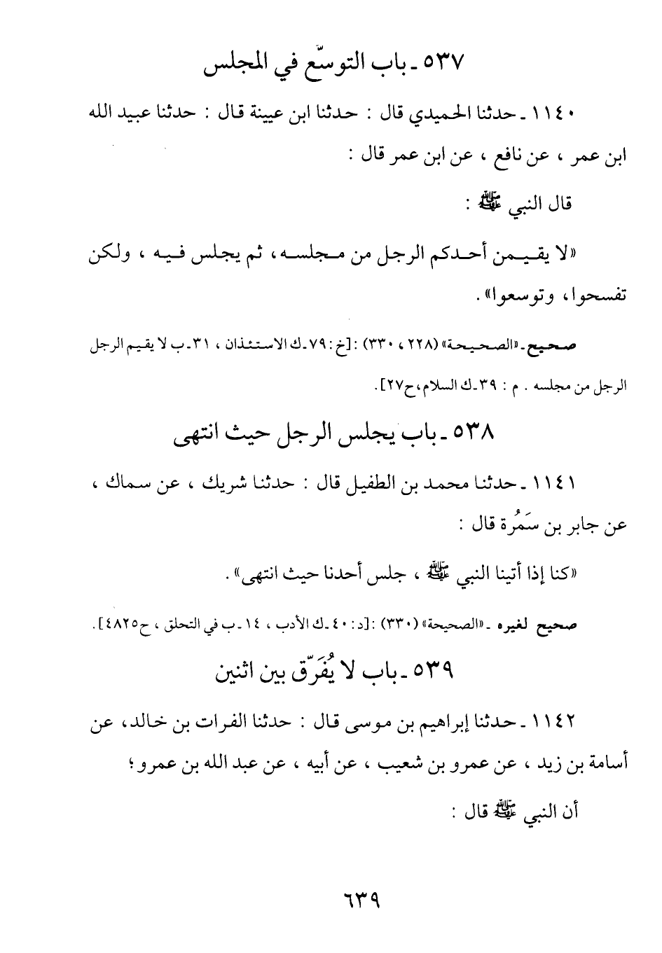 1140 - عن ابن عمر رضي الله عنهما قَالَ: قَالَ النَّبِيُّ صَلَّى اللهُ عَلَيْهِ وَسَلَّمَ: (لَا يُقِيمَنَّ أَحَدُكُمُ الرَّجُلَ مِنْ مَجْلِسِهِ ثُمَّ يجلس فيه ولكن تفسحوا وتوسعوا)