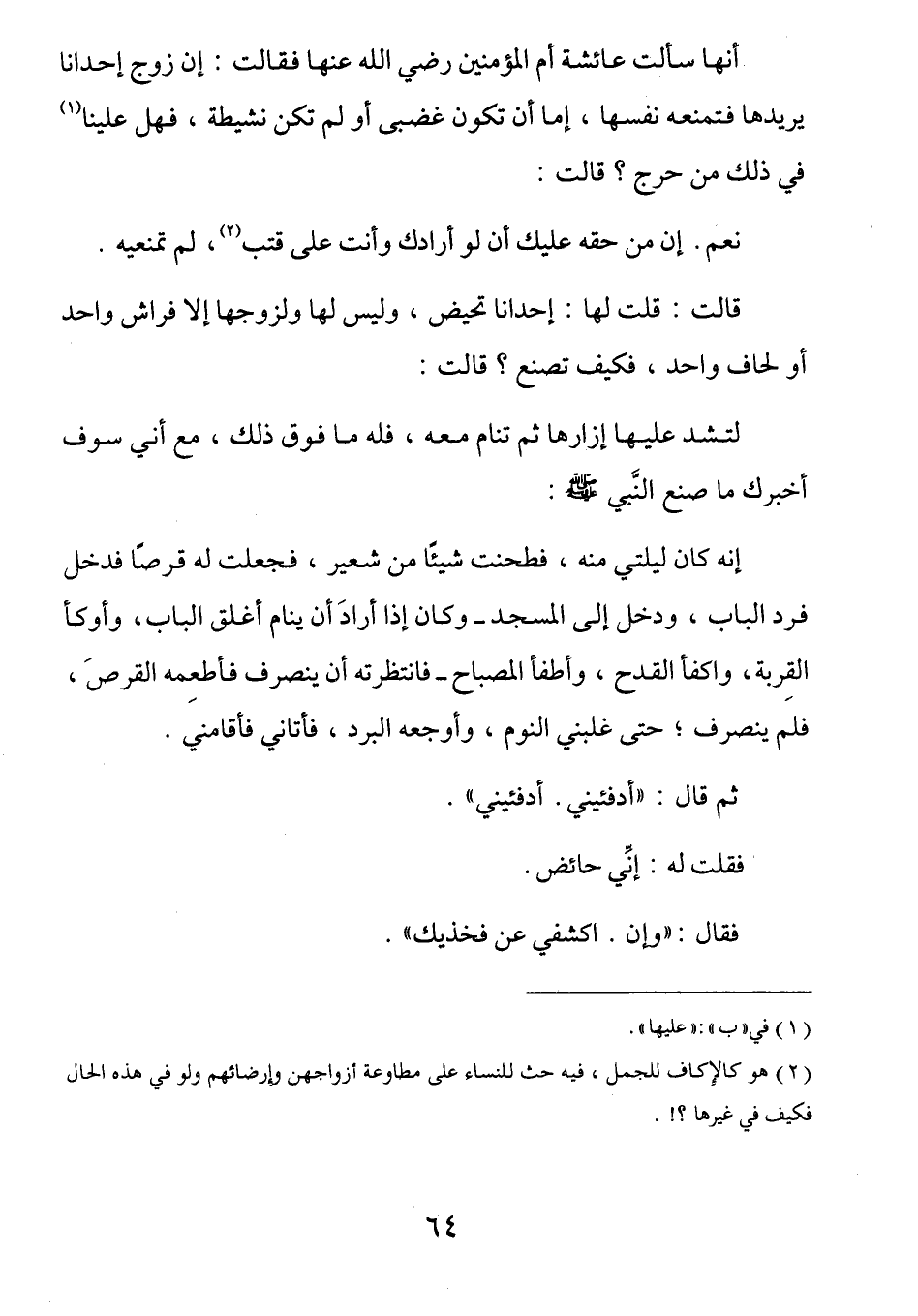 أَنَّهَا سَأَلَتْ عَائِشَةَ أُمَّ الْمُؤْمِنِينَ رَضِيَ اللَّهُ عنه فَقَالَتْ: إِنَّ زَوْجَ إِحْدَانَا يُريدها فَتَمْنَعُهُ نَفْسَهَا إِمَّا أَنْ تَكُونَ غَضَبَى أَوْ لَمْ تَكُنْ نَشِيطَةً فَهَلْ عَلَيْنَا فِي ذَلِكَ مِنْ حَرَجٍ؟ قَالَتْ: نَعَمْ إِنَّ مِنْ حَقِّهِ عَلَيْكِ أَنْ لَوْ أَرَادَكِ وَأَنْتِ عَلَى قَتَبٍ (¬1) لَمْ تَمْنَعِيهِ، قَالَتْ: قُلْتُ لَهَا إِحْدَانَا تَحِيضُ وَلَيْسَ لَهَا وَلِزَوْجِهَا إِلَّا فِرَاشٌ وَاحِدٌ أَوْ لِحَافٌ وَاحِدٌ فَكَيْفَ تَصْنَعُ؟