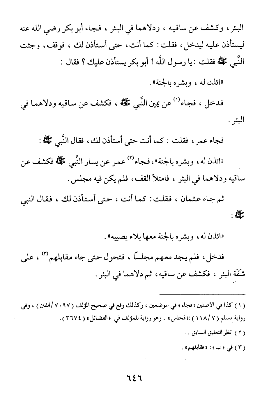 الْبِئْرِ وَكَشَفَ عَنْ سَاقَيْهِ وَدَلَّاهُمَا فِي الْبِئْرِ فَجَاءَ أَبُو بَكْرٍ رَضِيَ اللَّهُ عَنْهُ لِيَسْتَأْذِنَ عَلَيْهِ لِيَدْخُلَ فَقُلْتُ: كَمَا أَنْتَ حَتَّى أَسْتَأْذِنَ لَكَ فَوَقَفَ وَجِئْتُ النَّبِيَّ صَلَّى اللهُ عَلَيْهِ وَسَلَّمَ فَقُلْتُ يَا رَسُولَ اللَّهِ أَبُو بَكْرٍ يَسْتَأْذِنُ عَلَيْكَ. فَقَالَ: (ائْذَنْ لَهُ وَبَشِّرْهُ بِالْجَنَّةِ) فَدَخَلَ فَجَاءَ عَنْ يَمِينِ النَّبِيِّ صَلَّى اللهُ عَلَيْهِ وَسَلَّمَ فَكَشَفَ عَنْ سَاقَيْهِ وَدَلَّاهُمَا فِي الْبِئْرِ فَجَاءَ عُمَرُ فَقُلْتُ: كَمَا أَنْتَ حَتَّى أَسْتَأْذِنَ لَكَ. فَقَالَ النَّبِيُّ صَلَّى اللهُ عَلَيْهِ وَسَلَّمَ: (ائْذَنْ لَهُ وَبَشِّرْهُ بِالْجَنَّةِ) فَجَاءَ عُمَرُ عَنْ يَسَارِ النَّبِيِّ صَلَّى اللهُ عَلَيْهِ وَسَلَّمَ فَكَشَفَ عَنْ سَاقَيْهِ وَدَلَّاهُمَا فِي الْبِئْرِ فَامْتَلَأَ الْقُفُّ فَلَمْ يَكُنْ فِيهِ مَجْلِسٌ ثُمَّ جَاءَ عُثْمَانُ فَقُلْتُ: كَمَا أَنْتَ حَتَّى أَسْتَأْذِنَ لَكَ فَقَالَ النَّبِيُّ صَلَّى اللهُ عَلَيْهِ وَسَلَّمَ: (ائْذَنْ لَه وَبَشِّرْهُ بِالْجَنَّةِ مَعَهَا بَلَاءٌ يُصِيبُهُ) فَدَخَلَ فَلَمْ يَجِدْ مَعَهُمْ مَجْلِسًا فَتَحَوَّلَ حَتَّى جَاءَ مُقَابِلَهُمْ عَلَى شَفَةِ الْبِئْرِ فَكَشَفَ عَنْ سَاقَيْهِ ثُمَّ دَلَّاهُمَا فِي الْبِئْرِ