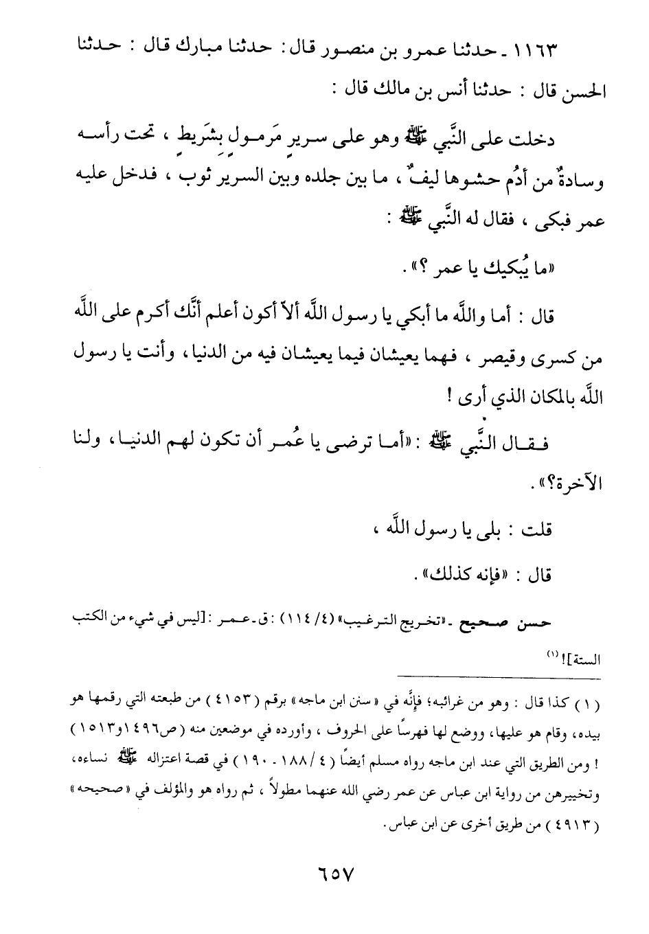 1163 - عن أَنَسُ بْنُ مَالِكٍ قَالَ دَخَلْتُ عَلَى النَّبِيِّ صَلَّى اللهُ عَلَيْهِ وَسَلَّمَ وَهُوَ عَلَى سَرِيرٍ مَرْمُولٍ بِشَرِيطٍ تَحْتَ رَأْسِهِ وِسَادَةٌ مِنْ أَدَمٍ حَشْوُهَا لِيفٌ مَا بَيْنَ جِلْدِهِ وَبَيْنَ السَّرِيرِ ثَوْبٌ فَدَخَلَ عَلَيْهِ عُمَرُ فَبَكَى فَقَالَ لَهُ النَّبِيُّ صَلَّى اللهُ عَلَيْهِ وَسَلَّمَ: (مَا يُبْكِيكَ يَا عُمَرُ؟) قَالَ: أَمَا وَاللَّهِ مَا أَبْكِي يَا رَسُولَ اللَّهِ أَلَّا أَكُونَ أَعْلَمُ أَنَّكَ أَكْرَمُ عَلَى اللَّهِ مِنْ كِسْرَى وَقَيْصَرَ فَهُمَا يعيشان فيما يعيشان فِيهِ مِنَ الدُّنْيَا وَأَنْتَ يَا رَسُولَ اللَّهِ بِالْمَكَانِ الَّذِي أَرَى فَقَالَ النَّبِيُّ صَلَّى اللهُ عَلَيْهِ وَسَلَّمَ: (أَمَا تَرْضَى يَا عُمَرُ أَنْ تَكُونَ لَهُمُ الدُّنْيَا وَلَنَا الْآخِرَةُ؟) قُلْتُ: بَلَى يا رسول الله قال: (فإنه كذلك)