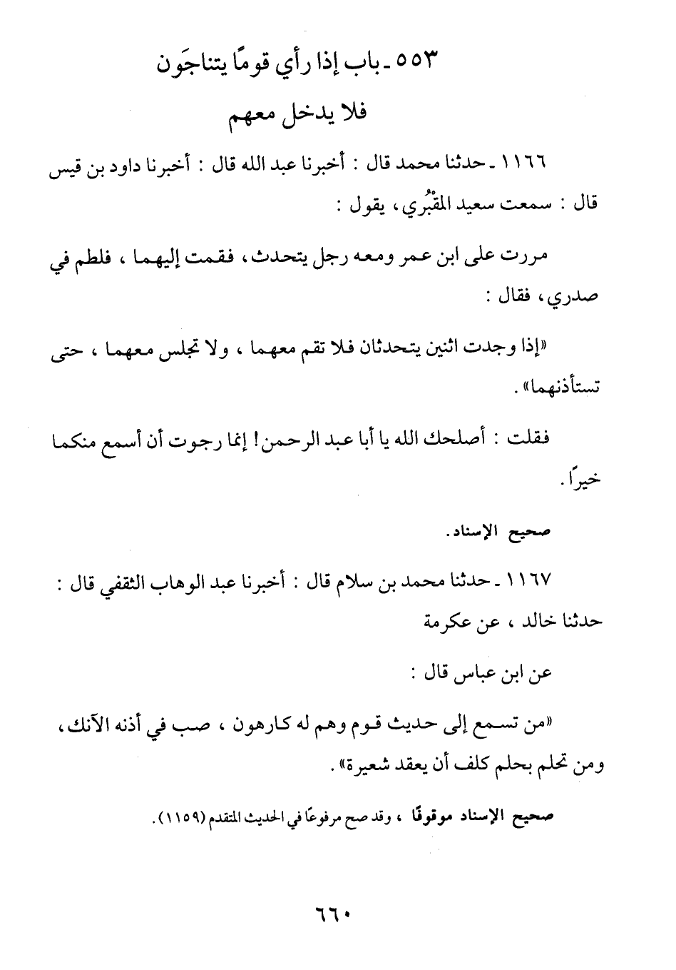1166 - (ث 319) عن سعيدا المقبري قال: مَرَرْتُ عَلَى ابْنِ عُمَرَ وَمَعَهُ رَجُلٌ يَتَحَدَّثُ فَقُمْتُ إِلَيْهِمَا فَلَطَمَ فِي صَدْرِي. فَقَالَ: إِذَا وَجَدْتَ اثْنَيْنِ يَتَحَدَّثَانِ فَلَا تَقُمُّ مَعَهُمَا وَلَا تَجْلِسْ مَعَهُمَا حَتَّى تَسْتَأْذِنَهُمَا فَقُلْتُ: أَصْلَحَكَ اللَّهُ يَا أَبَا عَبْدِ الرَّحْمَنِ إِنَّمَا رَجَوْتُ أَنْ أسمع منكما خيرا.