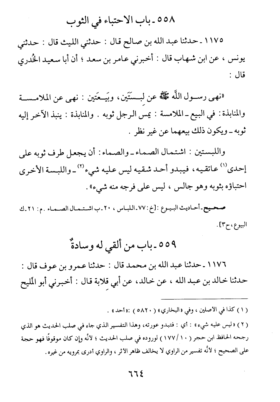 1175 - عَنْ أَبِي سَعِيدٍ الْخُدْرِيِّ رَضِيَ اللَّهُ عَنْهُ قَالَ: نَهَى رَسُولَ اللَّهِ صَلَّى اللهُ عَلَيْهِ وَسَلَّمَ عَنِ لِبْسَتَيْنِ وَبَيْعَتَيْنِ نَهَى عَنِ الْمُلَامَسَةِ وَالْمُنَابَذَةِ فِي الْبَيْعِ. الْمُلَامَسَةُ أَنْ يَمَسَّ الرَّجُلُ ثَوْبَهُ، وَالْمُنَابَذَةُ يَنْبُذُ الْآخَرُ إِلَيْهِ ثَوْبَهُ وَيَكُونُ ذلك بيعهما عن غير نظر واللبستان اشْتِمَالُ الصَّمَّاءِ وَالصَّمَّاءُ أَنْ يَجْعَلَ طَرَفَ ثَوْبِهِ عَلَى إِحْدَى عَاتِقَيْهِ فَيَبْدُو أَحَدُ شِقَّيْهِ لَيْسَ عَلَيْهِ شَيْءٌ، وَاللِّبْسَةُ الْأُخْرَى احْتِبَاؤُهُ بِثَوْبِهِ وَهُوَ جالس ليس على فرجه منه شيء.