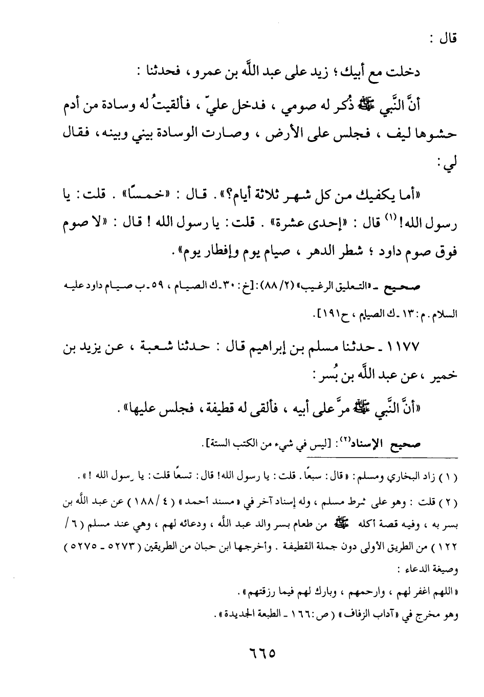قَالَ: دَخَلْتُ مَعَ أَبِيكَ زَيْدٍ عَلَى عَبْدِ اللَّهِ بْنِ عَمْرٍو فَحَدَّثَنَا أَنَّ النَّبِيَّ صَلَّى اللهُ عَلَيْهِ وَسَلَّمَ ذُكِرَ لَهُ صَوْمِي فَدَخَلَ عَلَيَّ فَأَلْقَيْتُ لَهُ وِسَادَةً مِنْ أَدَمٍ حَشْوُهَا لِيفٌ فَجَلَسَ عَلَى الْأَرْضِ وَصَارَتِ الْوِسَادَةُ بَيْنِي وَبَيْنَهُ فَقَالَ لِي: (أَمَا يَكْفِيكَ مِنْ كُلِّ شهر ثلاثة أيام؟) قُلْتُ يَا رَسُولَ اللَّهِ. قَالَ: (خَمْسًا) قُلْتُ يَا رَسُولَ اللَّهِ: قَالَ: (سَبْعًا) قُلْتُ يَا رَسُولَ اللَّهِ: قَالَ: (تِسْعًا) قُلْتُ يَا رَسُولَ اللَّهِ: (قَالَ إِحْدَى عَشْرَةَ) قُلْتُ يَا رَسُولَ اللَّهِ: (قَالَ لَا صَوْمَ فَوْقَ صَوْمِ دَاوُدَ شطر الدهر صيام يوم وإفطار يوم)