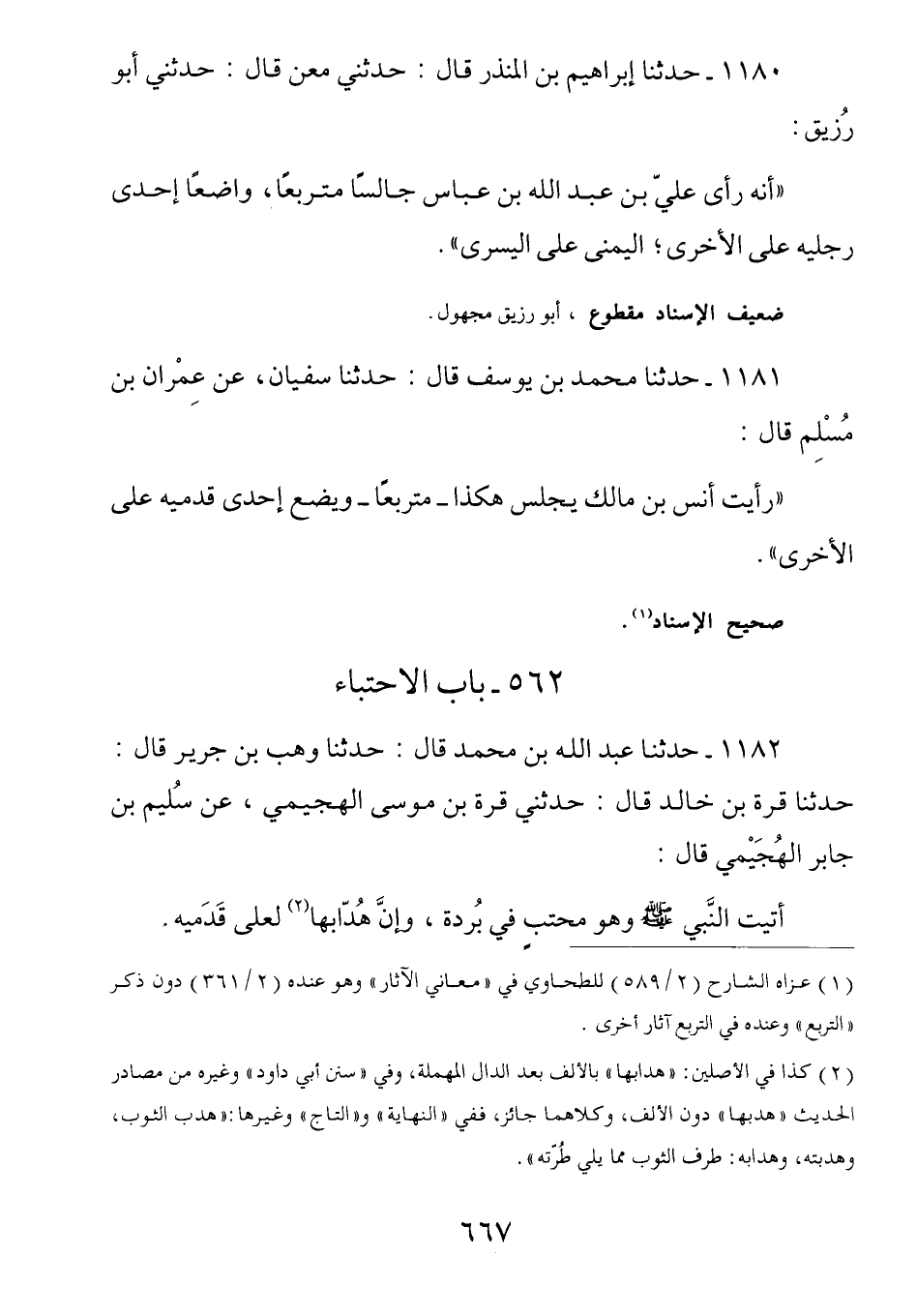 1181 - (ث 324) عَنْ عِمْرَانَ بْنِ مُسْلِمٍ قَالَ: رَأَيْتُ أَنَسَ بْنَ مَالِكٍ يَجْلِسُ هَكَذَا مُتَرَبِّعًا وَيَضَعُ إِحْدَى قدميه على الأخرى.