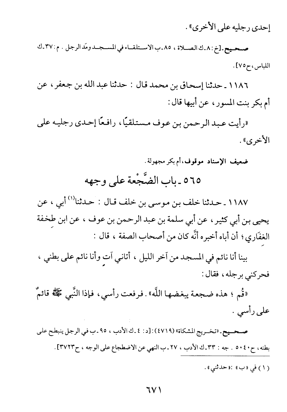 1187 - عَنِ ابْنِ طِخْفَةَ الْغِفَارِيِّ أَنَّ أَبَاهُ أَخْبَرَهُ أَنَّهُ كَانَ مِنْ أَصْحَابِ الصُّفَّةِ قَالَ: بَيْنَا أَنَا نَائِمٌ فِي الْمَسْجِدِ مِنْ آخِرِ اللَّيْلِ أَتَانِي آتٍ وَأَنَا نَائِمٌ عَلَى بَطْنِي فَحَرَّكَنِي بِرِجْلِهِ فَقَالَ: (قُمْ هَذِهِ ضَجْعَةٌ يُبْغِضُهَا اللَّهُ) فَرَفَعْتُ رَأْسِي فَإِذَا النَّبِيُّ صَلَّى اللهُ عَلَيْهِ وسلم قائم على رأسي