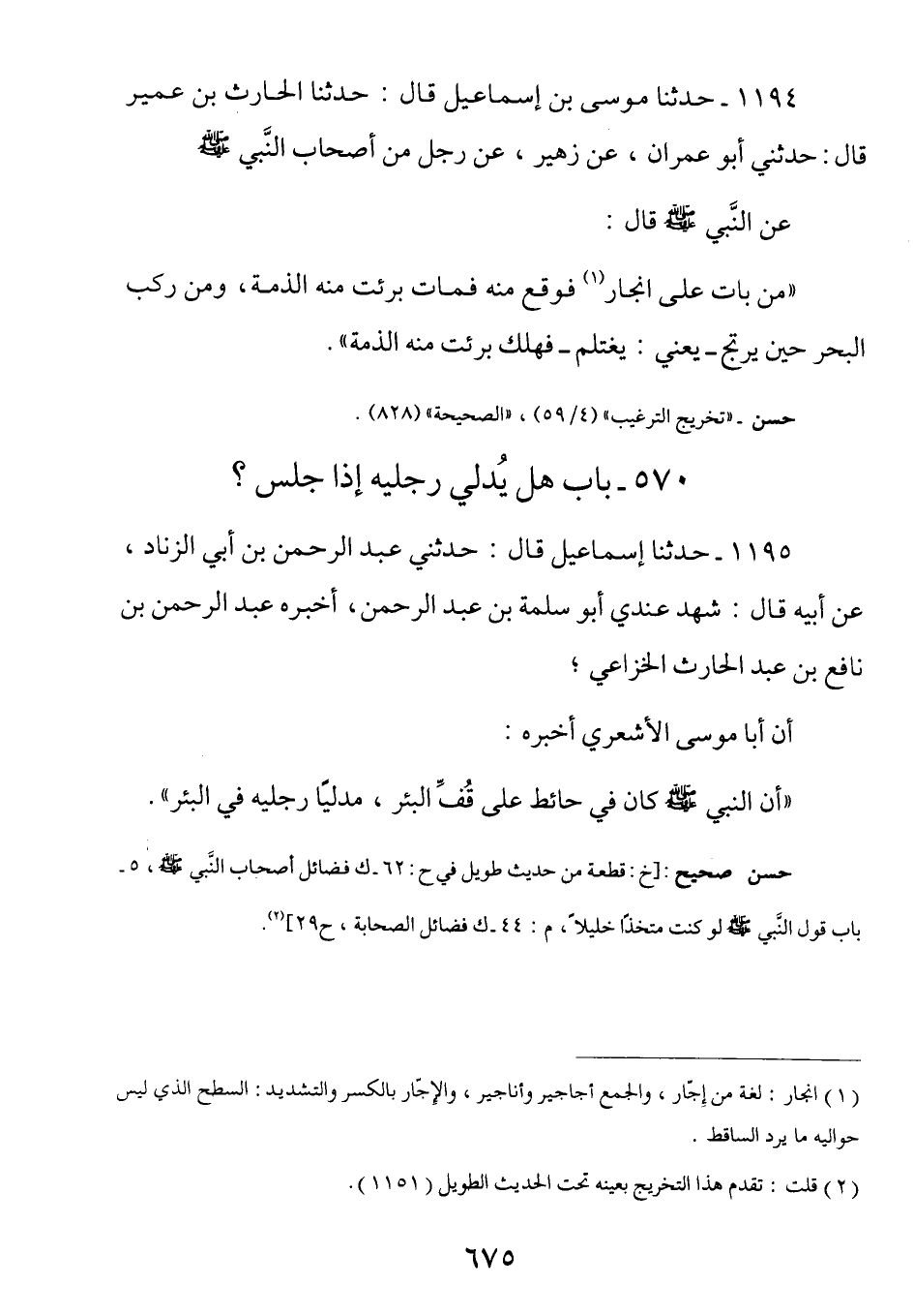 1195 - عن أبي موسى الأشعري رَضِيَ اللَّهُ عَنْهُ أَنَّ النَّبِيَّ صَلَّى اللهُ عَلَيْهِ وَسَلَّمَ كَانَ فِي حَائِطٍ عَلَى قُفِّ البئر مدليا رجليه في البئر.