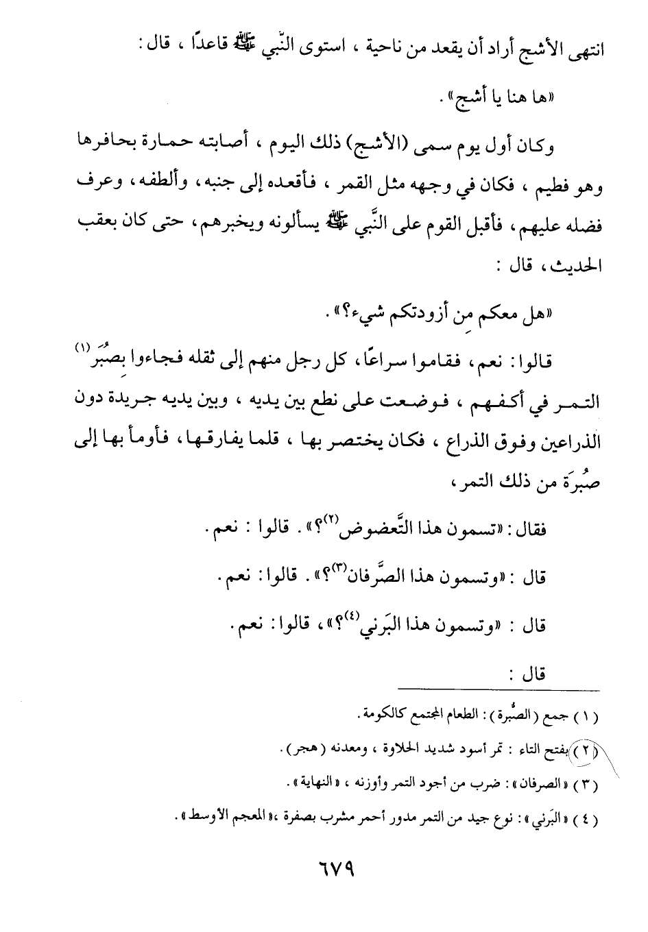 الْقَمَرِ فَأَقْعَدَهُ إِلَى جَنْبِهِ وَأَلْطَفَهُ وَعَرَفَ فَضْلَهُ عَلَيْهِمْ فَأَقْبَلَ الْقَوْمُ عَلَى النَّبِيِّ صَلَّى اللهُ عَلَيْهِ وَسَلَّمَ يَسْأَلُونَهُ وَيُخْبِرُهُمْ حَتَّى كَانَ بِعَقِبِ الْحَدِيثِ قَالَ: (هَلْ مَعَكُمْ مِنْ أَزْوِدَتِكُمْ شَيْءٌ؟) قَالُوا: نَعَمْ فَقَامُوا سِرَاعًا كُلُّ رَجُلٍ مِنْهُمْ إِلَى ثِقَلِهِ فَجَاءُوا بِصُبَرِ التَّمْرِ فِي أَكُفِّهِمْ فَوُضِعَتْ عَلَى نِطَعٍ بَيْنَ يَدَيْهِ وَبَيْنَ يَدَيْهِ جَرِيدَةٌ دُونَ الذِّرَاعَيْنِ وَفَوْقَ الذِّرَاعِ فَكَانَ يَخْتَصِرُ بِهَا قَلَّمَا يُفَارِقُهَا فَأَوْمَأَ بِهَا إِلَى صُبْرَةٍ مِنْ ذَلِكَ التَّمْرِ فَقَالَ: (تُسَمُّونَ هَذَا التَّعْضُوضَ؟) قَالُوا: نَعَمْ. قَالَ: (وَتُسَمُّونَ هَذَا الصَّرَفَانَ؟) قَالُوا: نَعَمْ. (وَتُسَمُّونَ هَذَا الْبَرْنِيَّ؟) قَالُوا: نَعَمْ قَالَ: