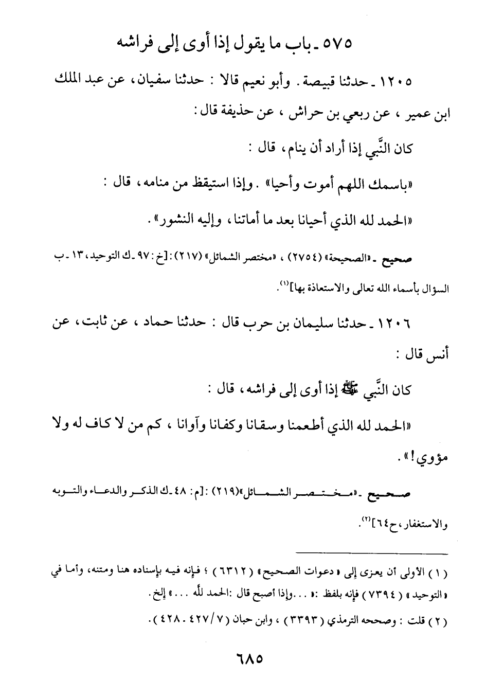 1205 - عن حذيفة رَضِيَ اللَّهُ عَنْهُ قَالَ: كَانَ النَّبِيُّ صَلَّى اللهُ عَلَيْهِ وَسَلَّمَ إِذَا أَرَادَ أَنْ يَنَامَ قَالَ: (بِاسْمِكَ اللَّهُمَّ أَمُوتُ وَأَحْيَا) وَإِذَا اسْتَيْقَظَ مِنْ مَنَامِهِ قَالَ: (الْحَمْدُ لِلَّهِ الَّذِي أَحْيَانَا بعد ما أماتنا وإليه النشور)