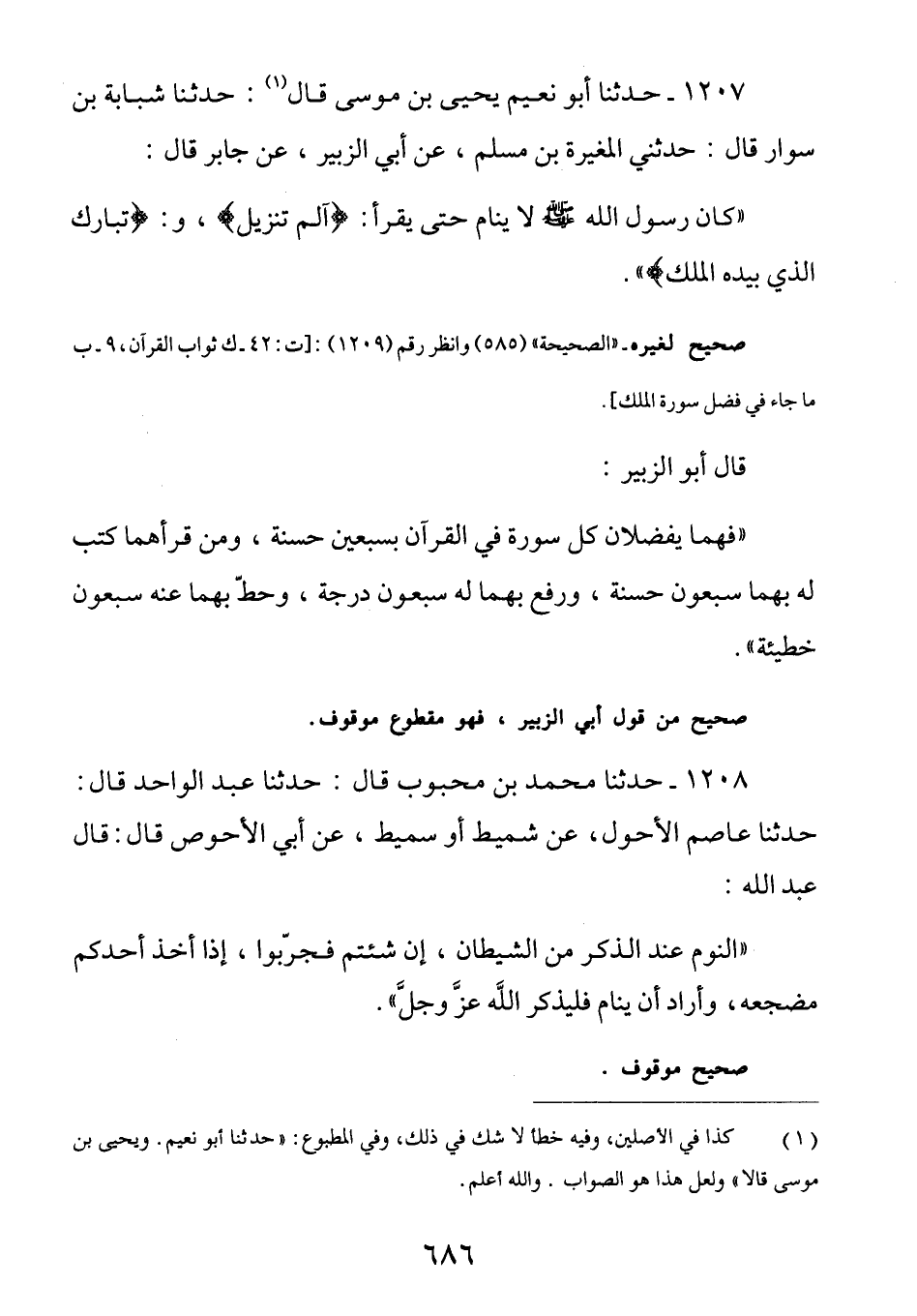 1207 - عن جابر رضي الله عنه قَالَ: كَانَ رَسُولُ اللَّهِ صَلَّى اللهُ عَلَيْهِ وَسَلَّمَ لَا يَنَامُ حَتَّى يَقْرَأَ: «ألَم~ * تَنْزِيلُ) السجدة. و: (تَبَارَكَ الذِّي بِيَدِه المُلْكُ) .