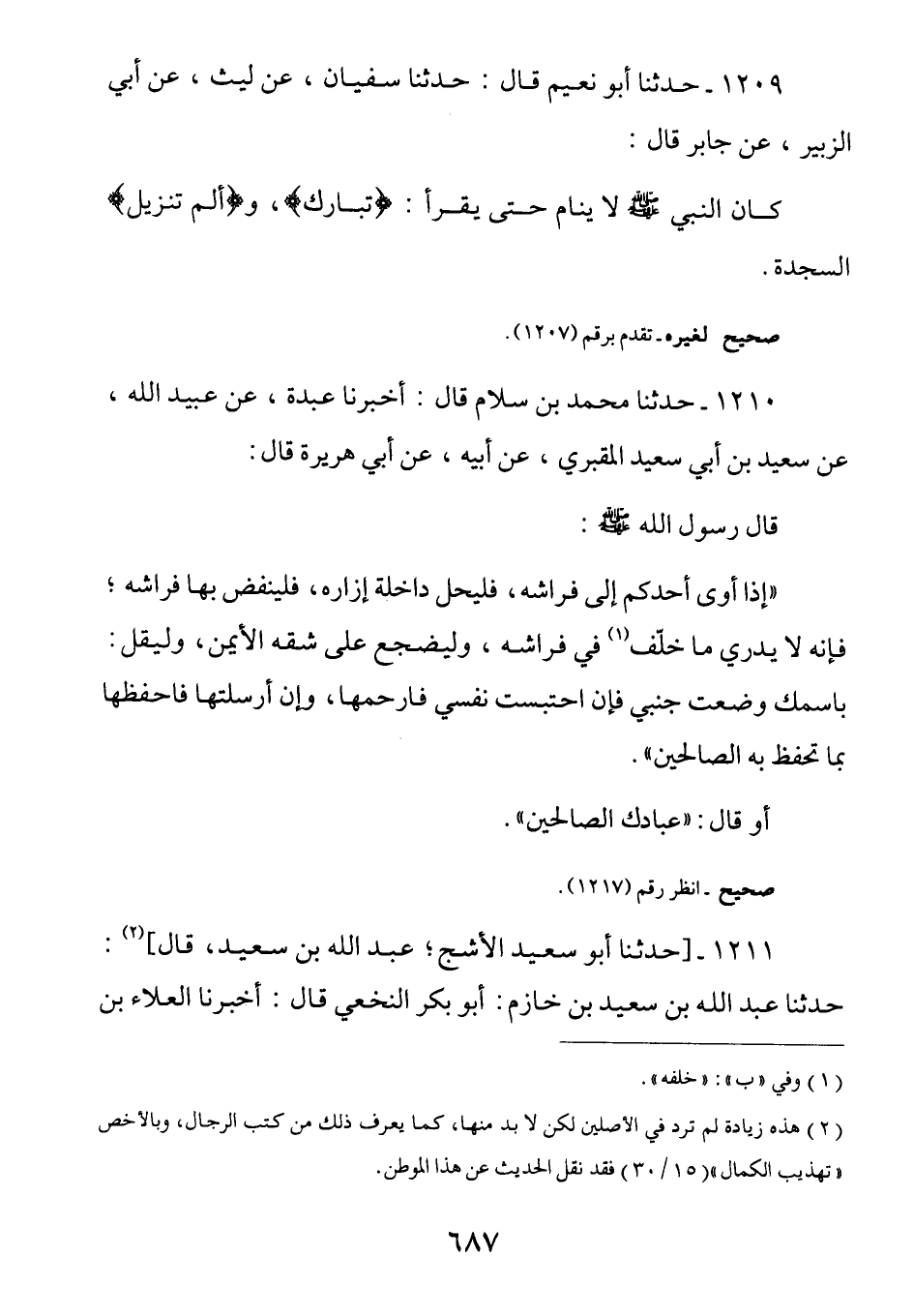 1210 - عن أبي هريرة رضي الله عنه قَالَ: قَالَ رَسُولُ اللَّهِ صَلَّى اللهُ عَلَيْهِ وَسَلَّمَ: (إِذَا أَوَى أَحَدُكُمْ إِلَى فِرَاشِهِ فَلْيَحِلَّ دَاخِلَةَ إِزَارِهِ فَلْيَنْفُضْ بِهَا فِرَاشَهُ فَإِنَّهُ لَا يَدْرِي مَا خَلَّفَ فِي فِرَاشِهِ وَلْيَضْطَجِعْ عَلَى شِقِّهِ الْأَيْمَنِ وَلْيَقُلْ بِاسْمِكَ وَضَعْتُ جَنْبِي فَإِنِ احْتَبَسَتْ نَفْسِي فَارْحَمْهَا وَإِنْ أَرْسَلْتَهَا فَاحْفَظْهَا بِمَا تَحْفَظُ بِهِ الصَّالِحِينَ - أَوْ قَالَ - عِبَادَكَ الصَّالِحِينَ)