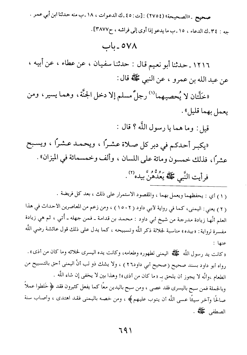 1216 - عن عبد الله بن عمرو رضي الله عنهما عَنِ النَّبِيِّ صَلَّى اللهُ عَلَيْهِ وَسَلَّمَ قَالَ: (خَلَّتَانِ لَا يُحْصِيهِمَا رَجُلٌ مُسْلِمٌ إِلَّا دَخَلَ الْجَنَّةَ وَهُمَا يَسِيرٌ وَمَنْ يَعْمَلُ بِهِمَا قَلِيلٌ) قِيلَ: وَمَا هُمَا يَا رَسُولَ اللَّهِ؟ قَالَ: (يُكَبِّرُ أَحَدُكُمْ فِي دُبُرِ كُلِّ صَلَاةٍ عَشْرًا وَيَحْمَدُ عَشْرًا وَيُسَبِّحُ عَشْرًا فَذَلِكَ خَمْسُونَ وَمِائَةٌ عَلَى اللِّسَانِ وَأَلْفٌ وَخَمْسُمِائَةٍ فِي الْمِيزَانِ) فَرَأَيْتُ النَّبِيَّ صَلَّى اللهُ عَلَيْهِ وَسَلَّمَ يَعُدُّهُنَّ بِيَدِهِ