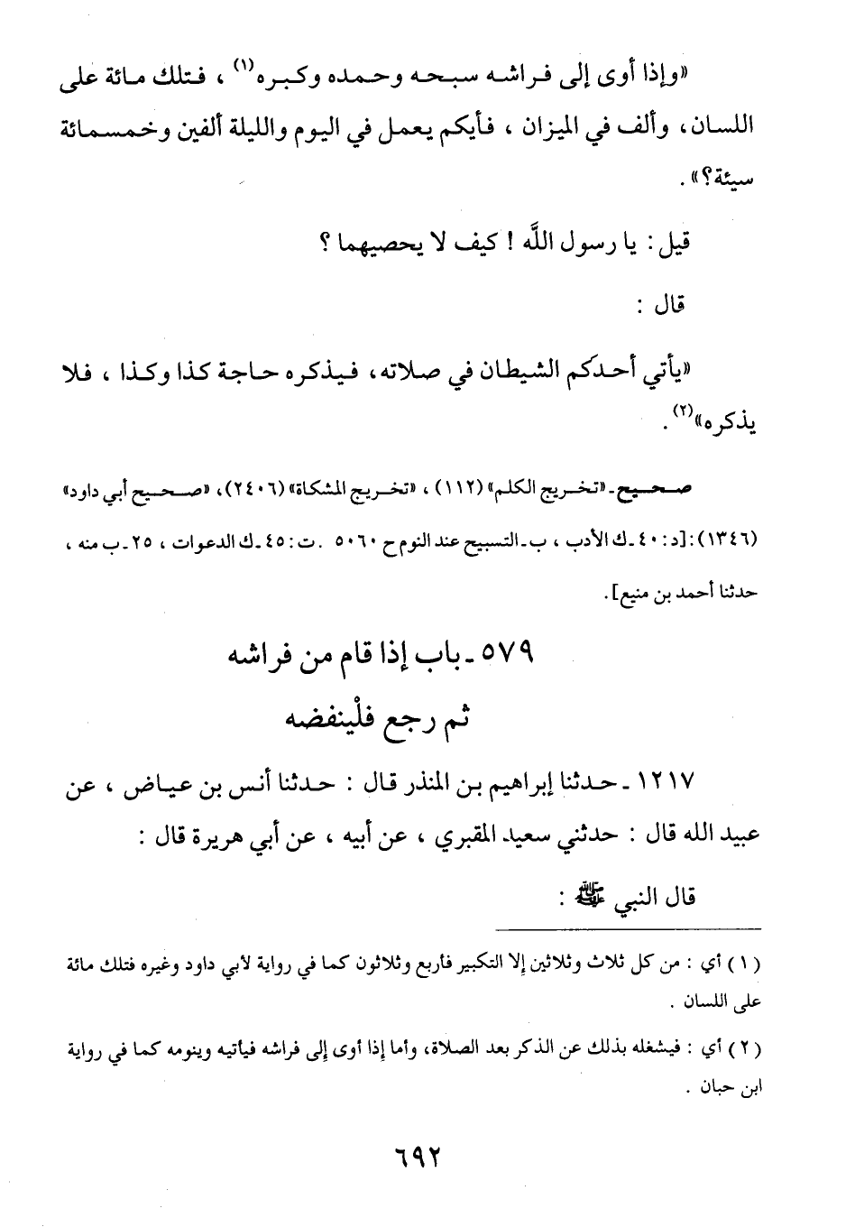 (وَإِذَا أَوَى إِلَى فِرَاشِهِ سَبَّحَهُ وَحَمِدَهُ وَكَبَّرَهُ فَتِلْكَ مِائَةٌ عَلَى اللِّسَانِ وَأَلْفٌ فِي الْمِيزَانِ فَأَيُّكُمْ يَعْمَلُ فِي الْيَوْمِ وَاللَّيْلَةِ أَلْفَيْنِ وَخَمْسَمِائَةِ سَيِّئَةٍ؟) قِيلَ: يَا رَسُولَ اللَّهِ كَيْفَ لَا يُحْصِيهِمَا؟ قَالَ: (يَأْتِي أَحَدَكُمُ الشَّيْطَانُ فِي صَلَاتِهِ فيذكره حاجة كذا وكذا فلا يذكره)