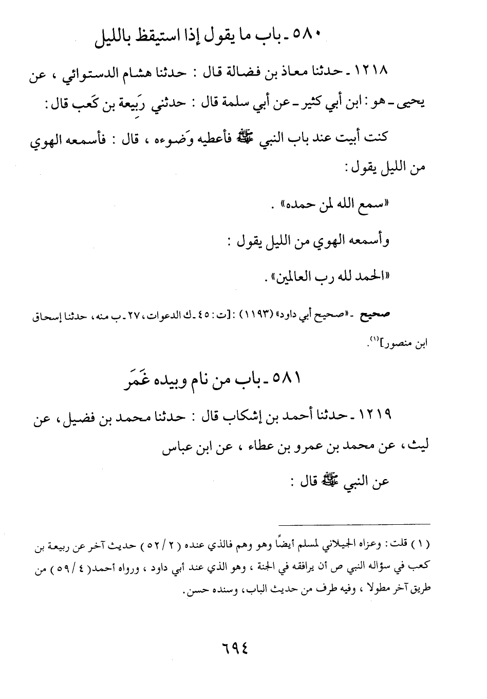 1218 - عن ربيعة بن كعب رضي الله عنه قَالَ: كُنْتُ أَبِيتُ عِنْدَ بَابِ النَّبِيِّ صَلَّى اللهُ عَلَيْهِ وَسَلَّمَ فَأُعْطِيهِ وَضُوءَهُ قَالَ: فَأَسْمَعُهُ الْهَوِيَّ مِنَ اللَّيْلِ يَقُولُ: (سَمِعَ اللَّهُ لِمَنْ حَمِدَهُ) وَأَسْمَعُهُ الْهَوِيَّ مِنَ اللَّيْلِ يَقُولُ: (الْحَمْدُ لله رب العالمين)