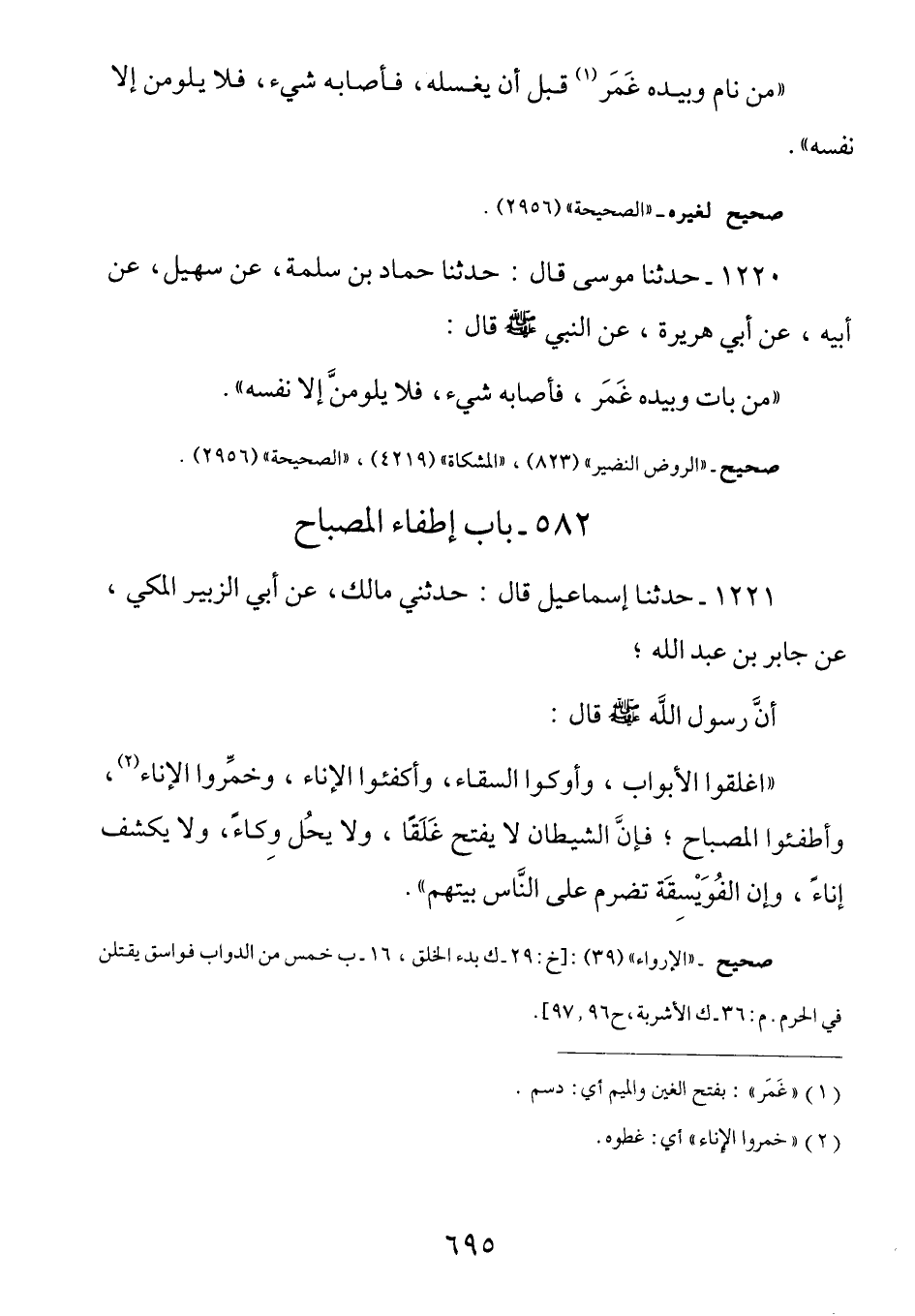 1221 - عن جابر بن عبد الله رضي الله عنهما أن رسول الله صلى الله عليه وسلم قال: (أغلقوا الأبواب وأوكئوا السِّقَاءَ وَأَكْفِئُوا الْإِنَاءَ وَخَمِّرُوا الْإِنَاءَ وَأَطْفِئُوا الْمِصْبَاحَ فَإِنَّ الشَّيْطَانَ لَا يَفْتَحُ غَلَقًا وَلَا يَحُلُّ وِكَاءً وَلَا يَكْشِفُ إِنَاءً وَإِنَّ الْفُوَيْسِقَةَ تُضْرِمُ على الناس بيتهم)