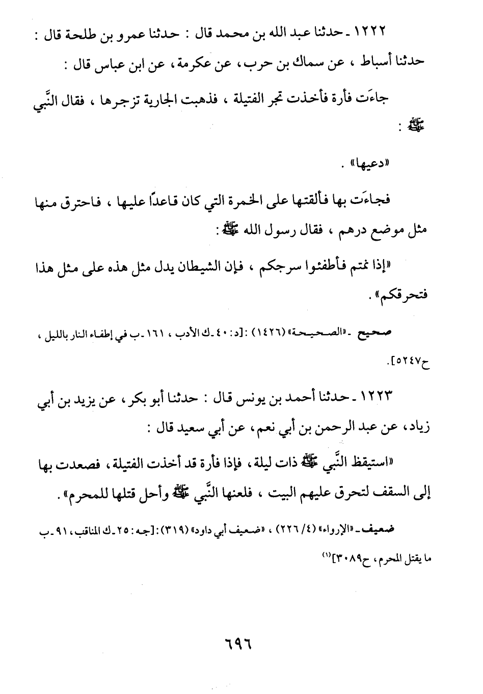 1222 - عن ابن عباس رضي الله عنهما قَالَ: جَاءَتْ فَأْرَةٌ فَأَخَذَتْ تَجُرُّ الْفَتِيلَةَ فَذَهَبَتِ الْجَارِيَةُ تَزْجُرُهَا فَقَالَ النَّبِيُّ صَلَّى اللهُ عَلَيْهِ وَسَلَّمَ دَعِيهَا فَجَاءَتْ بِهَا فَأَلْقَتْهَا عَلَى الْخُمْرَةِ الَّتِي كَانَ قَاعِدًا عَلَيْهَا فَاحْتَرَقَ مِنْهَا مِثْلُ مَوْضِعِ دِرْهَمٍ فَقَالَ رَسُولُ اللَّهِ صَلَّى اللهُ عَلَيْهِ وَسَلَّمَ: (إِذَا نِمْتُمْ فَأَطْفِئُوا سُرُجَكُمْ فَإِنَّ الشيطان يدل مثل هذه فتحرقكم)