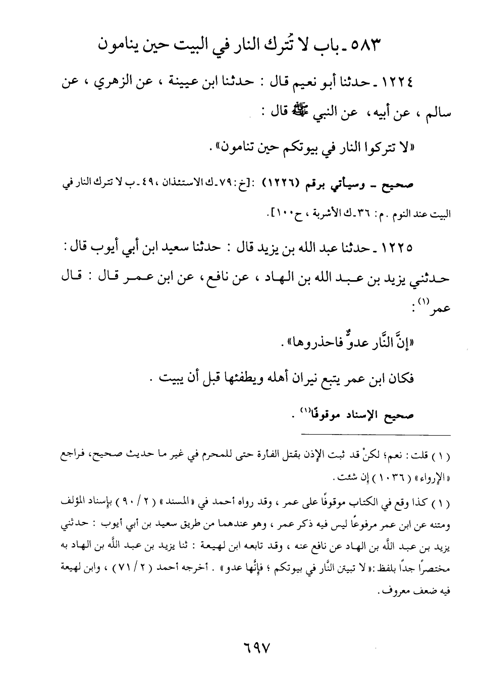 1224 - عَنْ سَالِمٍ عَنْ أَبِيهِ عَنِ النَّبِيِّ صَلَّى اللهُ عَلَيْهِ وَسَلَّمَ قَالَ: (لَا تَتْرُكُوا النَّارَ في بيوتكم حين تنامون)