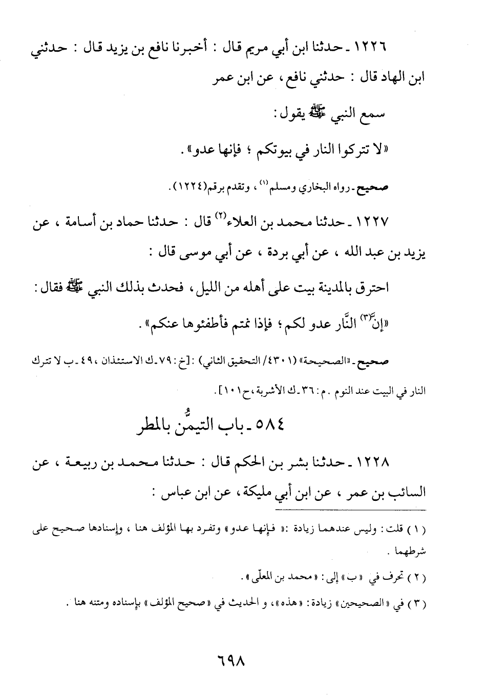 1226 - عَنِ ابْنِ عُمَرَ سَمِعَ النَّبِيَّ صَلَّى اللهُ عَلَيْهِ وَسَلَّمَ يَقُولُ: (لَا تَتْرُكُوا النَّارَ فِي بيوتكم فإنها عدو)