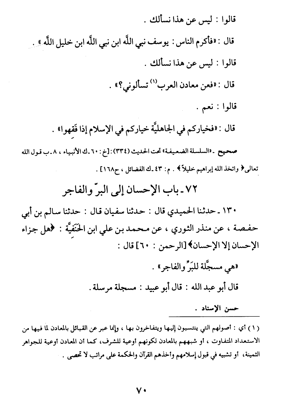 قَالُوا لَيْسَ عَنْ هَذَا نَسْأَلُكَ قَالَ: (فَأَكْرَمُ الناس يوسف نبي الله بن نبي الله بن خَلِيلِ اللَّهِ) قَالُوا لَيْسَ عَنْ هَذَا نَسْأَلُكَ قَالَ: (فَعَنْ مَعَادِنِ الْعَرَبِ تَسْأَلُونِي؟) قَالُوا: نَعَمْ قَالَ: (فخيارُكم فِي الْجَاهِلِيَّةِ خيارُكم فِي الْإِسْلَامِ إذا فَقِهُوا)