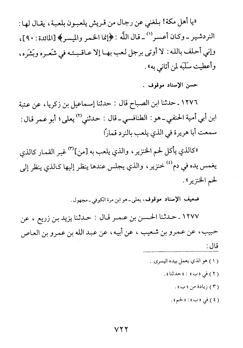 1276 - (ث362) حدثنا بْنُ الصَّبَّاحِ قَالَ حَدَّثَنَا إِسْمَاعِيلُ بْنُ زَكَرِيَّا عَنْ عُبَيْدِ بْنِ أَبِي أُمَيَّةَ الْحَنَفِيِّ هُوَ الطنافسي قال حدثني يعلى بن مُرَّةَ قَالَ سَمِعْتُ أَبَا هُرَيْرَةَ فِي الَّذِي يَلْعَبُ بِالنَّرْدِ قِمَارًا كَالَّذِي يَأْكُلُ لَحْمَ الْخِنْزِيرِ والذي يلعب به غَيْرِ الْقِمَارِ كَالَّذِي يَغْمِسُ يَدَهُ فِي دَمِ خِنْزِيرٍ وَالَّذِي يَجْلِسُ عِنْدَهَا يَنْظُرُ إِلَيْهَا كَالَّذِي ينظر إلى لحم الخنزير
