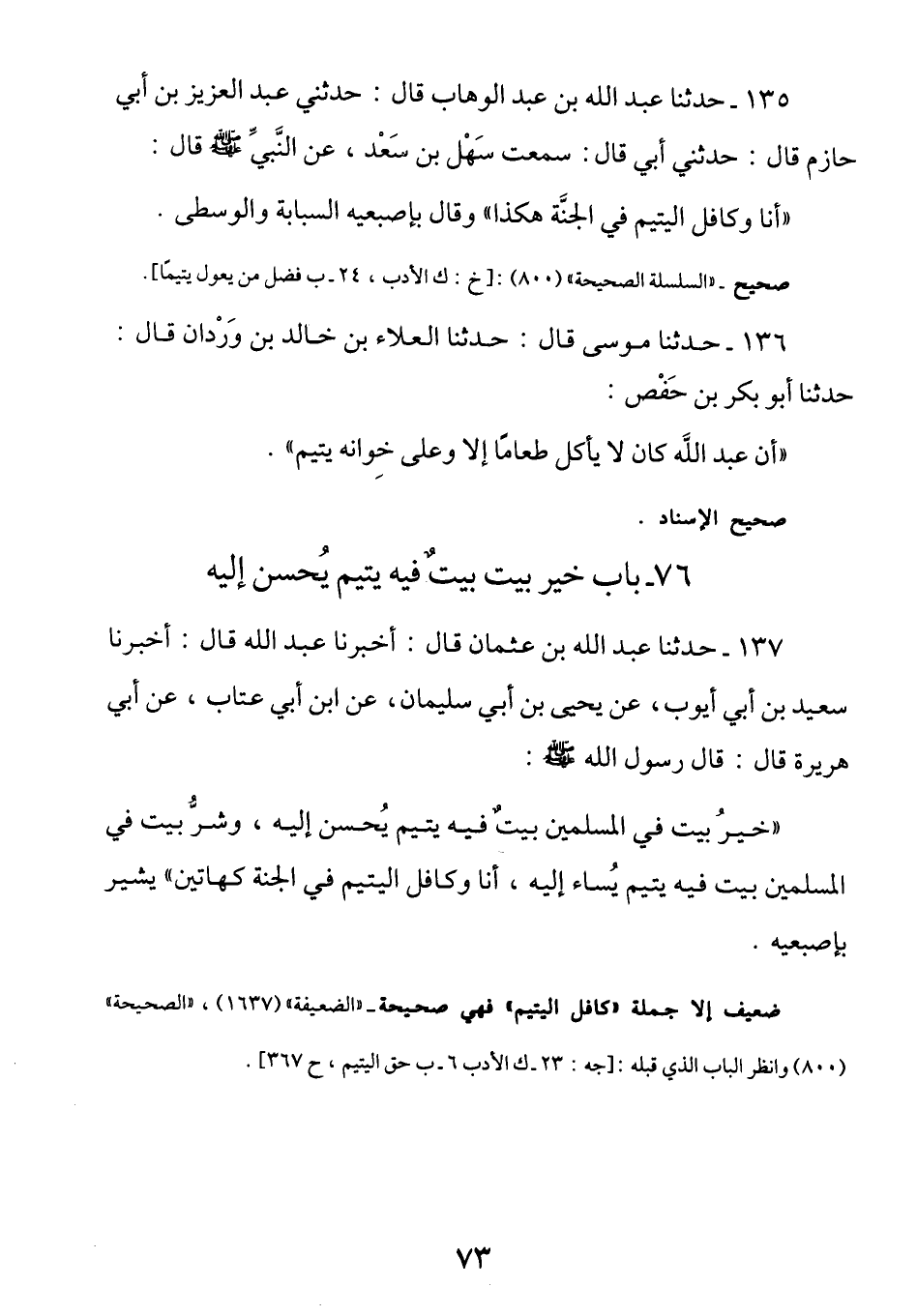 137 - عن أبى هريرة - رضي الله عنه - قَالَ: قَالَ رَسُولُ اللَّهِ صَلَّى اللهُ عَلَيْهِ وَسَلَّمَ: (خَيْرُ بيتٍ فِي الْمُسْلِمِينَ بيتٌ فِيهِ يتيمٌ يحسنُ إِلَيْهِ، وَشَرُّ بَيْتٍ فِي الْمُسْلِمِينَ بَيْتٌ فِيهِ يَتِيمٌ يُساء إِلَيْهِ، أَنَا وَكَافِلُ اليتيم في الجنة كهاتين) يشير بإصبعيه.