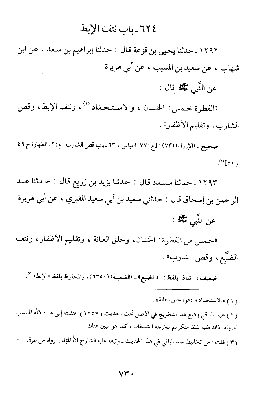 1293 - عَنْ أَبِي هُرَيْرَةَ رَضِيَ اللَّهُ عَنْهُ عَنِ النَّبِيِّ صَلَّى اللهُ عَلَيْهِ وَسَلَّمَ: (خَمْسٌ مِنَ الْفِطْرَةِ الْخِتَانُ وَحَلْقُ الْعَانَةِ وَتَقْلِيمُ الْأَظْفَارِ ونتف الضبع وقص الشارب)