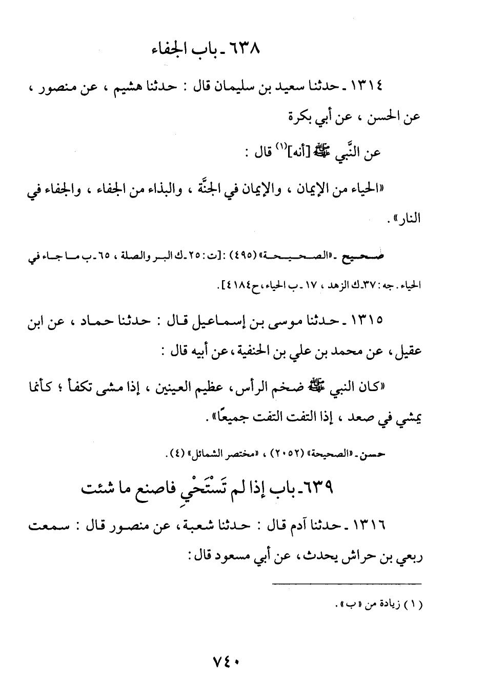 صحيح ـ «الصحيحة» (495) : [ت: 25ـ ك البر والصلة , 25ـ ب ماجاء في الحياء. جه: 37ـ ك الزهد 17ـ ب الحياء , ح 4184]