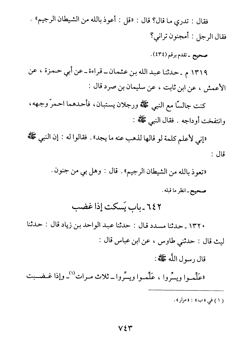 1319 - عن سليمان بن صرد رضي الله عنه قَالَ: كُنْتُ جَالِسًا مَعَ النَّبِيِّ صَلَّى اللهُ عَلَيْهِ وَسَلَّمَ وَرَجُلَانِ يَسْتَبَّانِ فَأَحَدُهُمَا احْمَرَّ وَجْهُهُ وَانْتَفَخَتْ أَوْدَاجُهُ فَقَالَ النَّبِيُّ صَلَّى اللهُ عَلَيْهِ وَسَلَّمَ: (إِنِّي لَأَعْلَمُ كَلِمَةً لَوْ قَالَهَا لَذَهَبَ عَنْهُ مَا يَجِدُ) فَقَالُوا لَهُ أَنَّ النَّبِيَّ صَلَّى اللهُ عَلَيْهِ وَسَلَّمَ قَالَ: (تَعَوَّذْ بِاللَّهِ مِنَ الشَّيْطَانِ الرَّجِيمِ) قَالَ وَهَلْ بِي مِنْ جنون