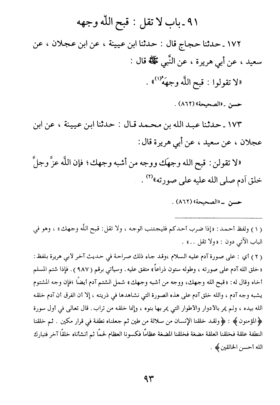 173 - عن أبى هريرة - رضي الله عنه - قَالَ: (لَا تَقُولَنَّ قَبَّحَ اللَّهُ وَجْهَكَ ووجهَ مَنْ أشبهَ وجهَك، فَإِنَّ اللَّهَ عَزَّ وَجَلَّ خَلَقَ آدَمَ صَلَّى اللهُ عَلَيْهِ وَسَلَّمَ عَلَى صُورته)